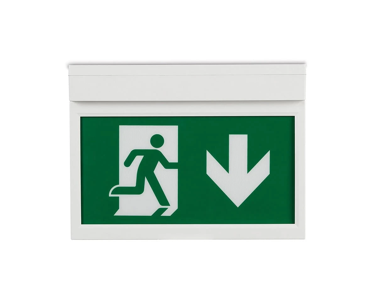 An emergency exit blade label, showing exit sign down · · · Comes as an PVC label for ease of installation · · Instantly and unmistakably indicate the exit routes · · Complying with ISO 3864-1, and proud members of the ICEL