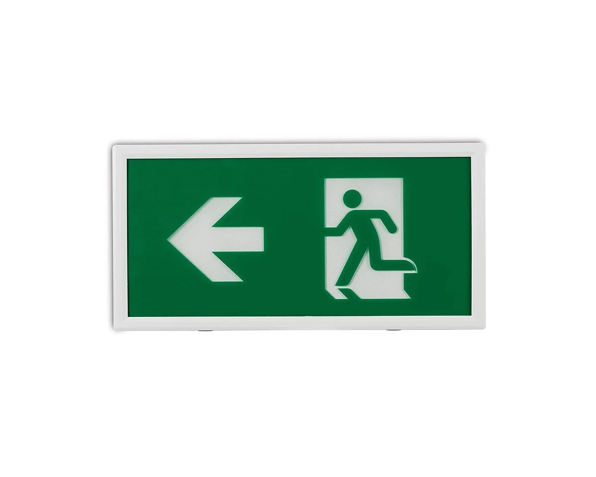 An emergency exit box label, showing exit sign left · · · Comes as an PVC label for ease of installation · · Instantly and unmistakably indicate the exit routes · · Complying with ISO 3864-1, and proud members of the ICEL