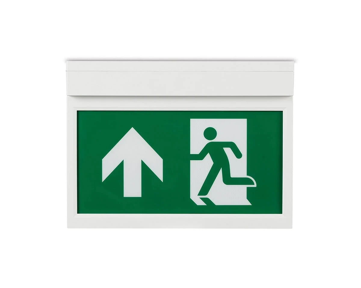 An emergency exit blade label, showing exit sign up · · · Comes as an PVC label for ease of installation · · Instantly and unmistakably indicate the exit routes · · Complying with ISO 3864-1, and proud members of the ICEL · · 1m H05RN-F rubber cable attached for permanent use outdoors