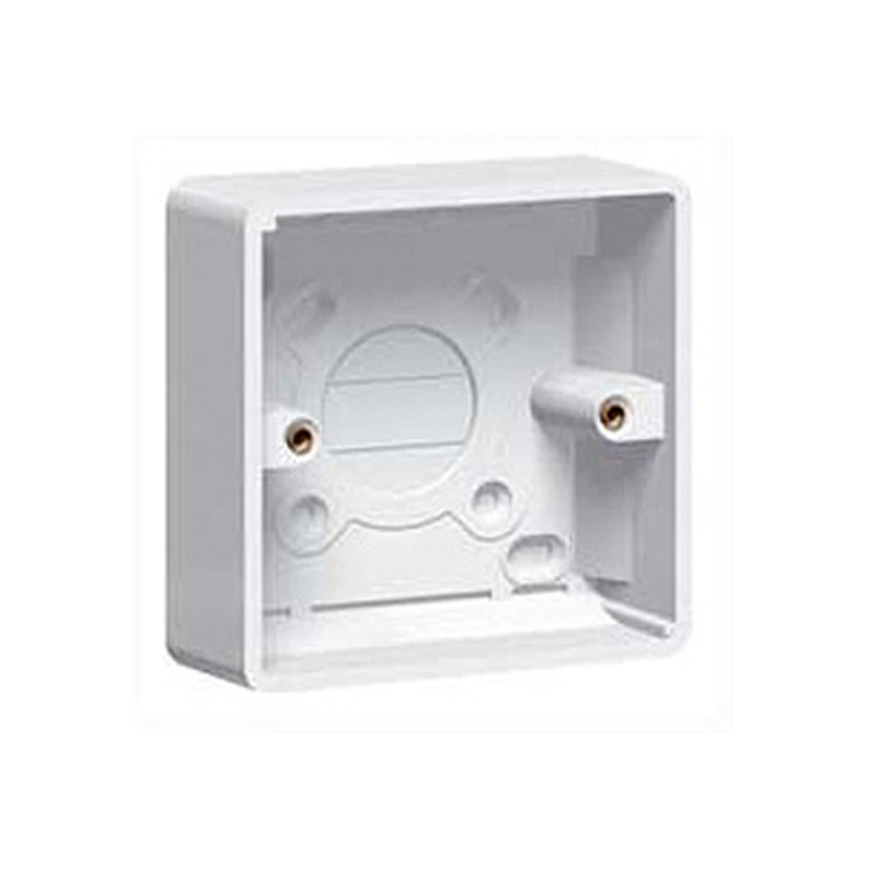 Technical Specifications Technical Specifications Surface mounted box for wiring accessories Material Plastic Degree of protection (IP rating) IP2X Assembly Surface mounted box Surface finish Matt Material qualifier Urea formaldehyde Colour White Mounting direction Horizontal Surface protection Untreated Shape Square Height 86 mm Width 86 mm RAL-number (similar) – Number of module spaces (modular system) 1 Number of units/gangs 1 Number of entry points – Diameter – mm Depth 35 mm Number of earth terminals – Halogen free Yes Shock resistant Yes Transparent No With cable entry/outlet Yes Suitable for modular domestic switching devices No With trunking entry Yes Desktop device No With conduit entry No Compliant with BS 4662 No Suitable for mounting over existing flush mounted box No With cover frame No Breakaway box for trunking mounting No Entry point on rear No With screw gland entry No