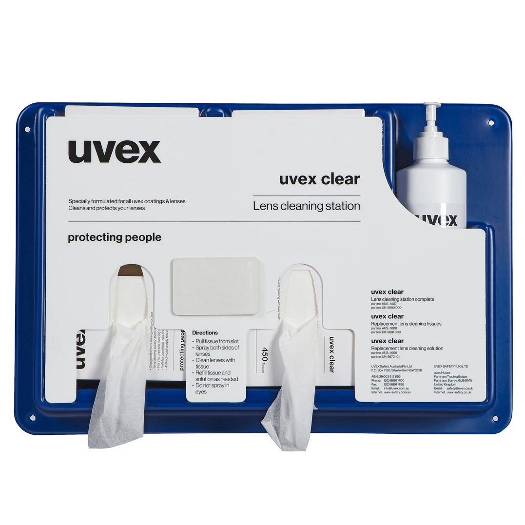 Keep your safety spectacles clean! The practical uvex spectacle cleaning station can be attached with a wall bracket wherever is convenient, enabling you and your staff to access it quickly. · · · Specially designed for anti-mist and scratch-resistant coatings · · Mounting screws and double-sided stickers for wall mounting · · Suitable for all uvex safety spectacles · · Can be refilled with silicone-free and anti-static tissues · · Cleaning tissues that are non-abrasive and highly absorbing · · The station is wall-mountable, so it’s easy to keep it out of the way.