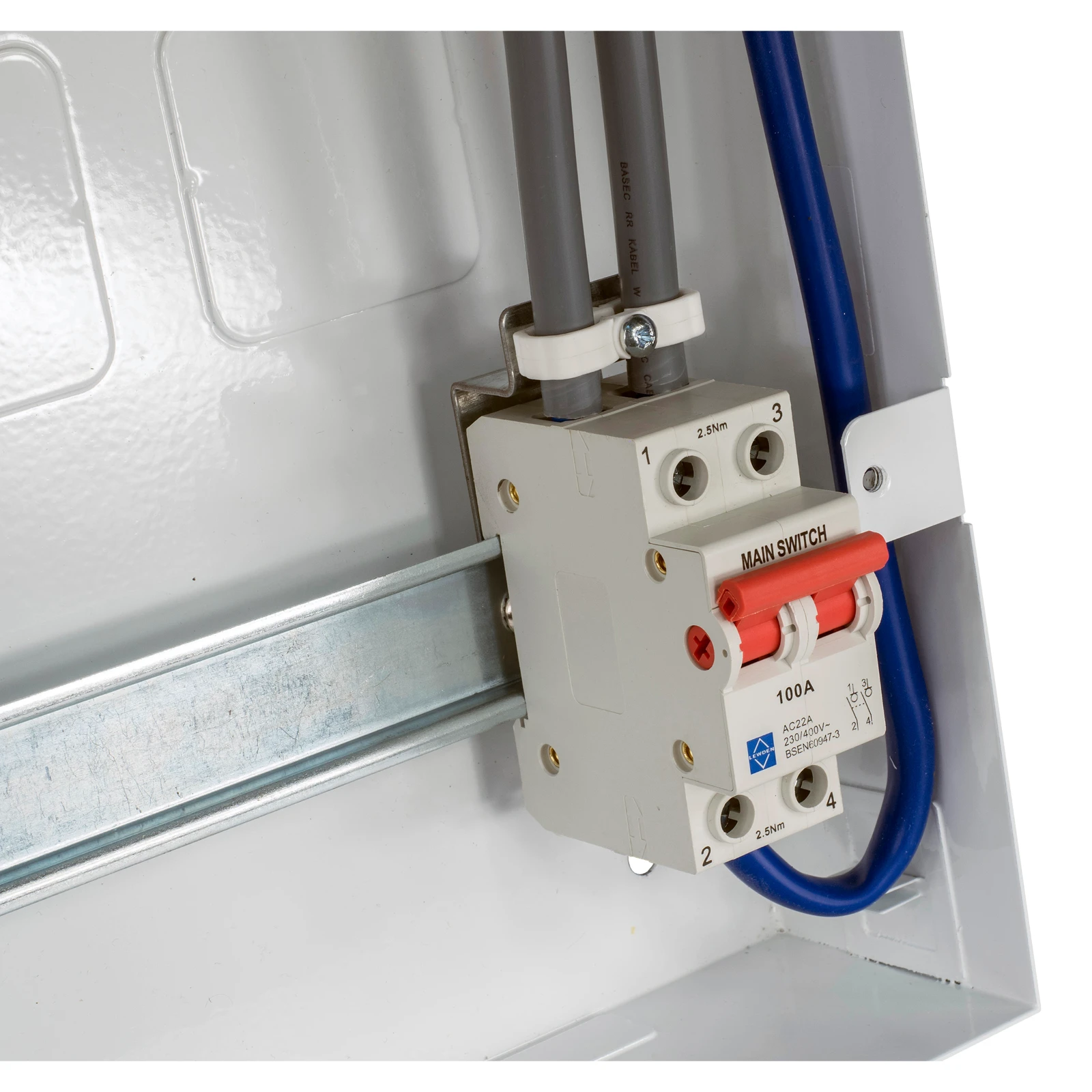 Safely secures the incoming meter tails preventing any strain on the cables from being transmitted to the main switch. For use with a two pole main switch. Allows an RCBO to be positioned next to the main switch, avoiding the need to use a blank in this position. · · · 2 Pole · · Terminal capacity 25mm2 · · Restraint wraps around cables to ensure movement of the meter tails is prevented. · · Provides additional support for incoming tails.