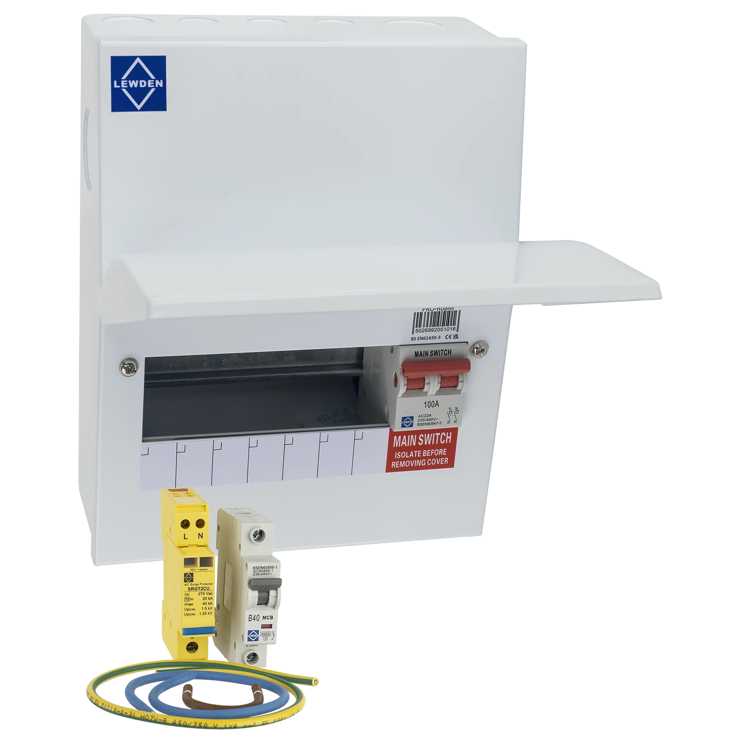 Lewden 10 Way Main Switch Consumer Unit with Square Knockouts – supplied complete with Surge Protection Kit, which requires installation. · · · Supplied complete with main switch & Type 2 SPD · · Selection of Square knockouts for mini trunking and conduits. · · One extra module for installation of SPD. · · New & Improved with extra installation height