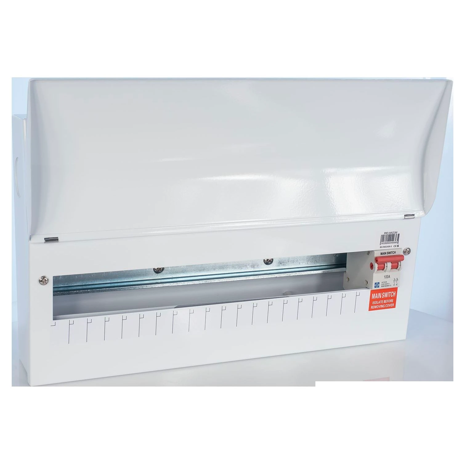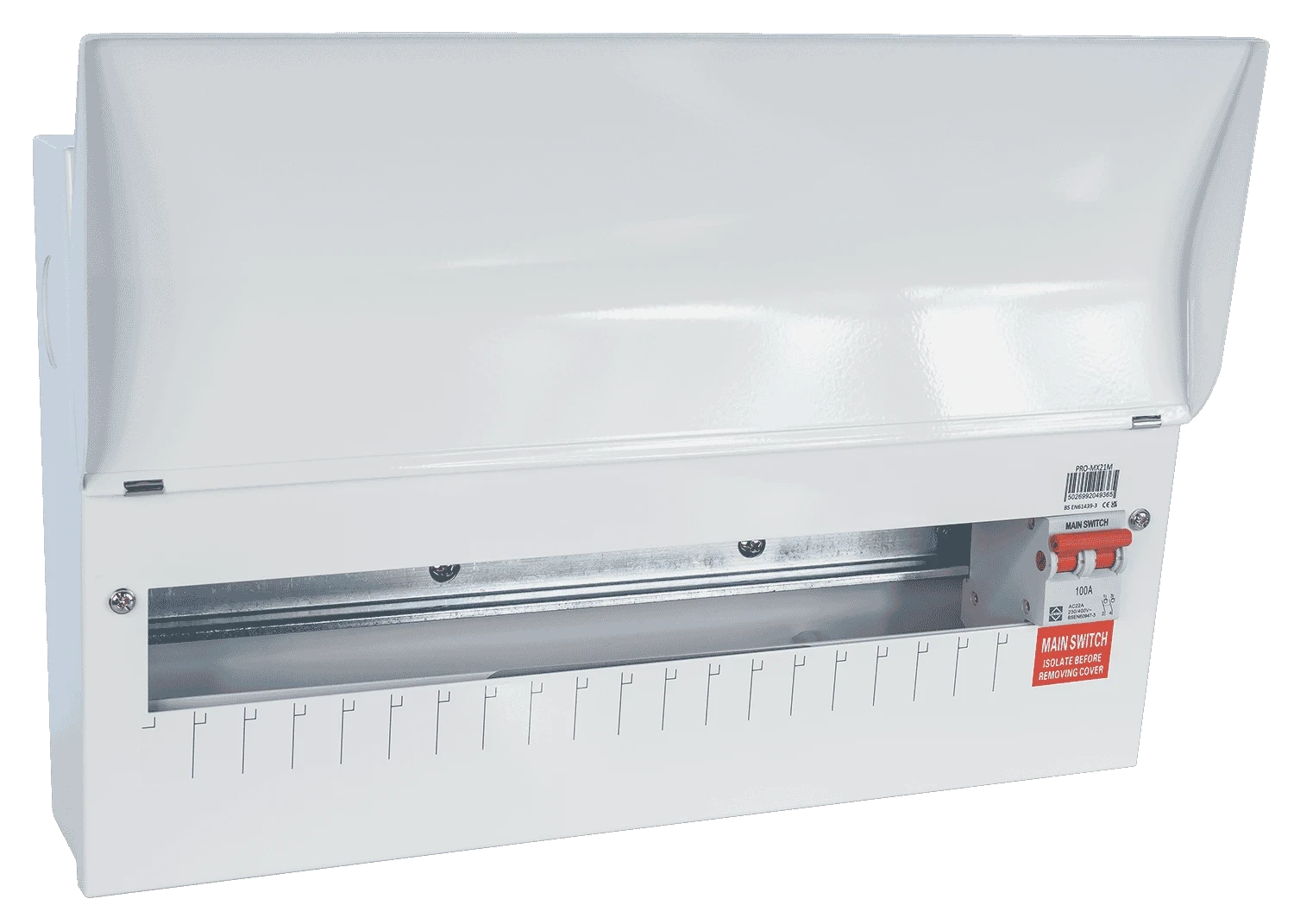 PRO offers a stylish, ergonomic, & non-obtrusive consumer unit design, paired with a comprehensive range of circuit protection devices and accessories to meet the needs of every installation. This 21 way PRO Consumer Unit comes complete with 100A DP Main Switch · · · 21 Way · · 100A DP Main Switch · · Extra wiring space with no restrictions under the DIN rail · · 20mm, 25mm & 32mm Knockouts to top, bottom, back and sides · · Both 18th Edition and Amendment 3 compliant · · Multiple fixing points · · 266x443x106mm (HWD)
