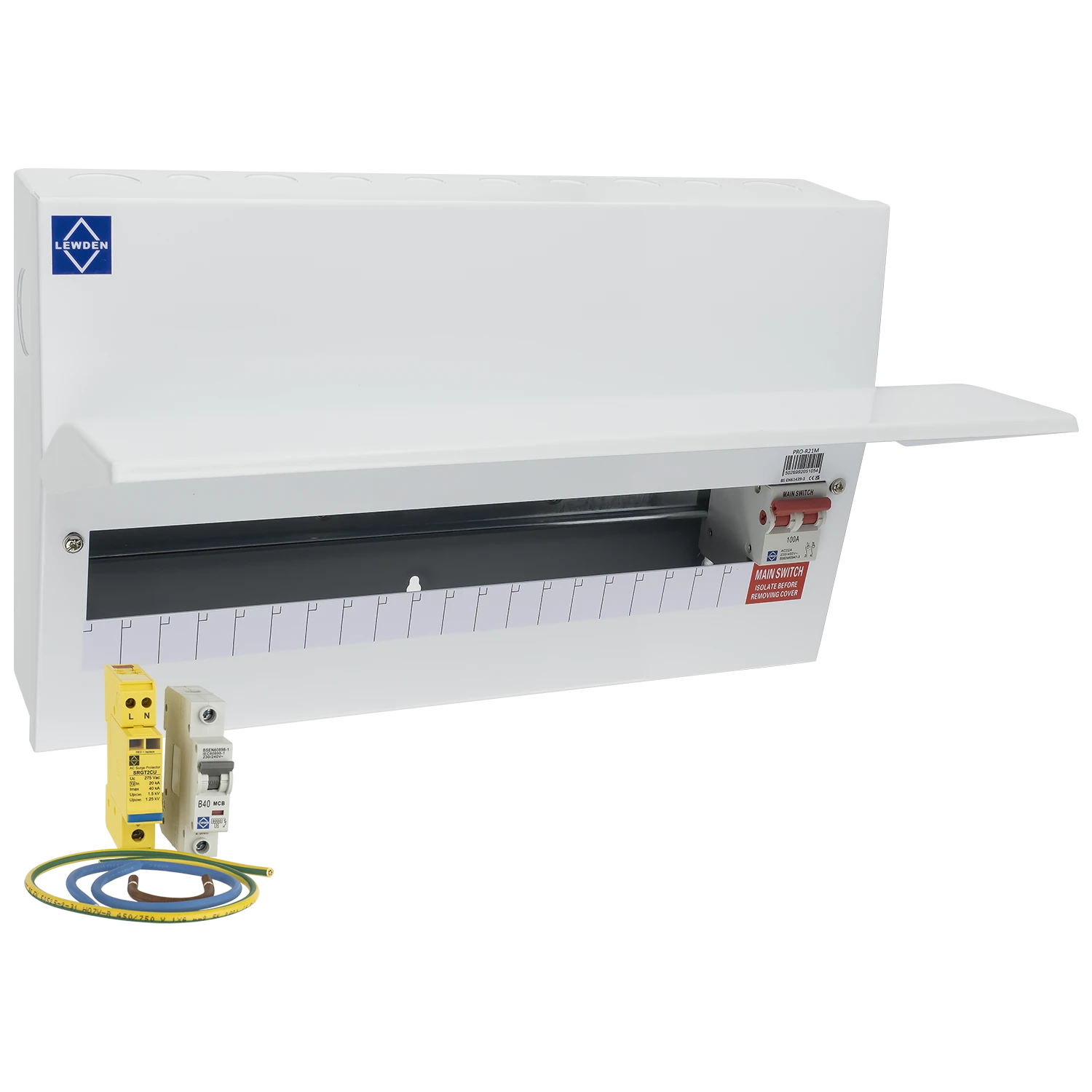 Lewden 8 Way Main Switch Consumer Unit with Round Knockouts – supplied complete with Surge Protection Kit, which requires installation. · · · Supplied complete with main switch & Type 2 SPD · · Selection of Round knockouts. · · One extra module for installation of SPD. · · New & Improved with extra installation height