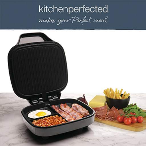 funnel” | Non-stick fixed plates | Thermostatically controlled heat setting | Power & temperature indicators | Hinged & locking lid | Cool touch