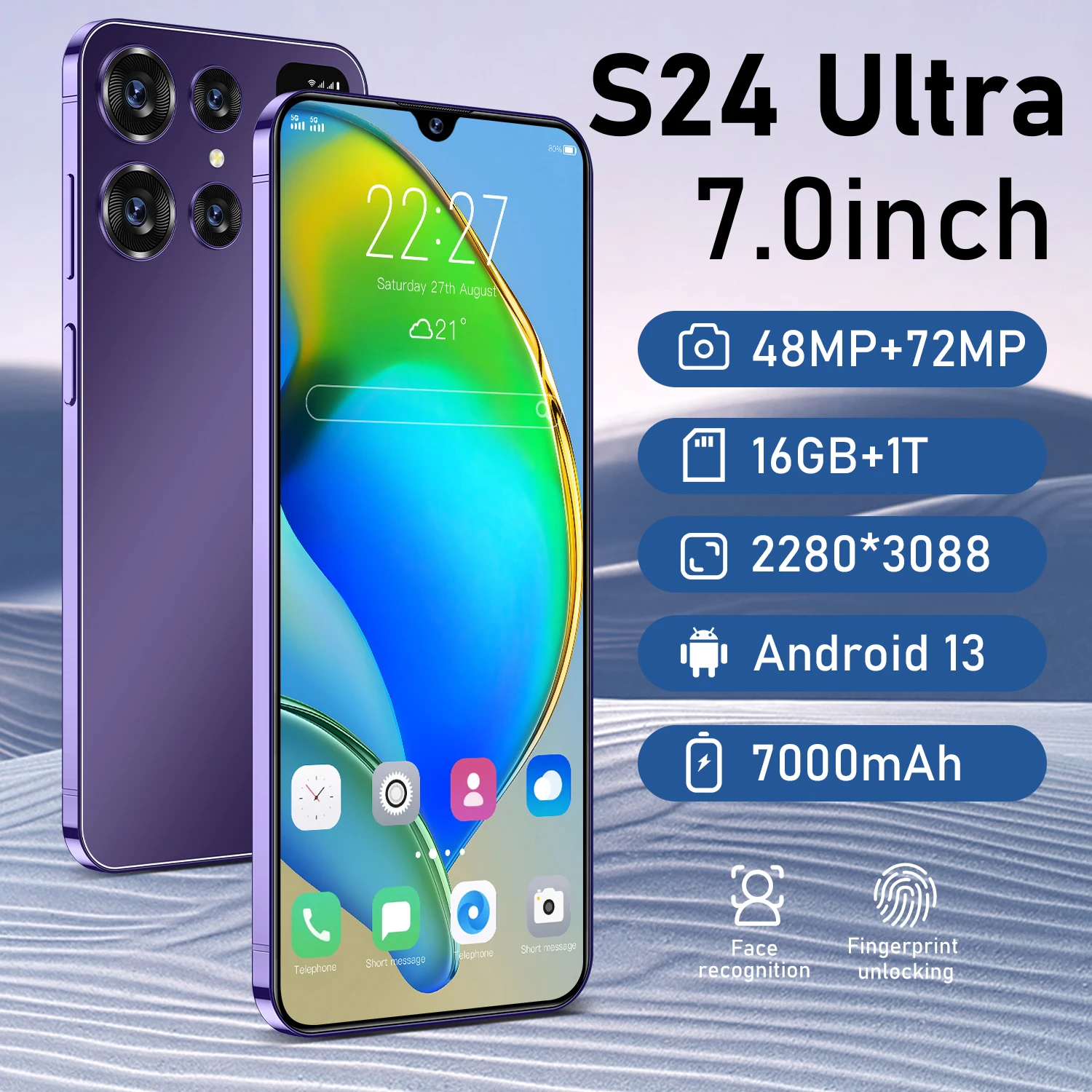New Original Mobile Phone S24 Ultra Face Id Unlocked Cellphones Android Mobile Phone Smart Phones Smartphone Factory direct sales, better quality but lower price is our target and mission! Feature – 7.0inch Full Display The S24 Ultra delivers the viewingexperience you always wanted, With a massive 93%screen-to-body ratio on a 7.0inch screen – 48MP Front CameraClear and Stylish Selfies The S24 Ultra world-leading 48MP front camera turnsyour every selfe into a work of art Experience greaterbrightness, color vibrancy, clarity and dynamic range.even in the dimmest light, Whenever you needit. your S24 Ultra+ is right there with you, capturing everymoment with crystal-clear precision, Turn your selfiesinto masterpieces and shine in every photo -72MP Rear HD camera The S24 Ultra features a 72MP camera combination. The main camera sportsa large f2.0 aperture and 1.28um pixels, This strong combination boosts photosensitibityin backlight or low light, Just point and shoot, and S24 Ultra+ will makesure your pictures remain clear and bright – Face Access The S24 Ultra also supports facial recognitionUpon activation,S24 Ultra scans your facial features and unlocks instaneouslyAccessing your phone has never been so easy, or so fun – Powerful Performance The Qualcomm 8 Gen 2 mobile platform with 10mm process technology makesyoung people who love the young and stiand other popular games.The game ison and lower – Android 13 The new interactive design makes the operation simple and simple, the use of themobile phone is so simple and straightforward, everything is handy – Dual SIM card supports TF card Dual card dual standby, card slot does notdistinguish between the main and the deputy, supporting the worlds 50 major communication carrier networks Specification 1.Model No.S24 Ultra 2.Platform Qualcomm 8 Gen 2 3.Standby Dual sim dual standby(Dual SIM+Dedicated micro SD Card Slot) 4.Screen7.0 HD Full Display 2280*3088 5.Speaker 1511 Box Speaker 6.FrequencyGSM850 900 1800 1900MHz,3GWCDMA850 1900 2100MHz,4G LTE 5G 7.Vibration Support 8.Colors Black .Blue .Purple 9.Memory 16GB RAM+1TB ROM 10.Multi Media MP3MP43GPFM RadioBluetooth 11.Camera 48MP+72MP 12.Multi Function Full screen, Face recognition, Dual SIM, Wifi, GPS, Gravity Sensor, Alarm ,Calendar ,Calculator ,Audio recorder ,Video recorder, WAPMMSGPR, Image viewer,E-Book,World clock,Tasks card rear flash IML rear cover 13.Languages Multi-language support 14.Others Android 13 System 15.Battery 7000mAh Lithium-ion battery Attention Due to the difference in light, the actual color of the phone may be slightly different from the screen and the picture. Color names are only used to distinguish between individual SKUs. Please understand that. Thank you. The battery capacity is typical of the factory laboratory, the specific charging speed, the length of use and other data, the actual situation will be slightly different due to the power cord, power adapter, ambient temperature. When the phone is completely out of power and automatically shuts down, you need to charge your phone for more than 10 minutes to boot. It is recommended to charge when the battery is less than 20% charged. Available memory capacity is subject to preloaded software Product images and models, data, functions, performance, specifications, etc. are for reference only.We may improve the above contents. For details, please refer to the product and . Unless otherwise stated, the data contained in this website are our internal test results, and the comparisons are compared with our products. The mobile phone does not support the telecom CDMA Package Included 1 x Smartphone, 1 x Charger Adapter, 1 x Headphones, 1 x User Manual 1 x phone case 1 x Protection film