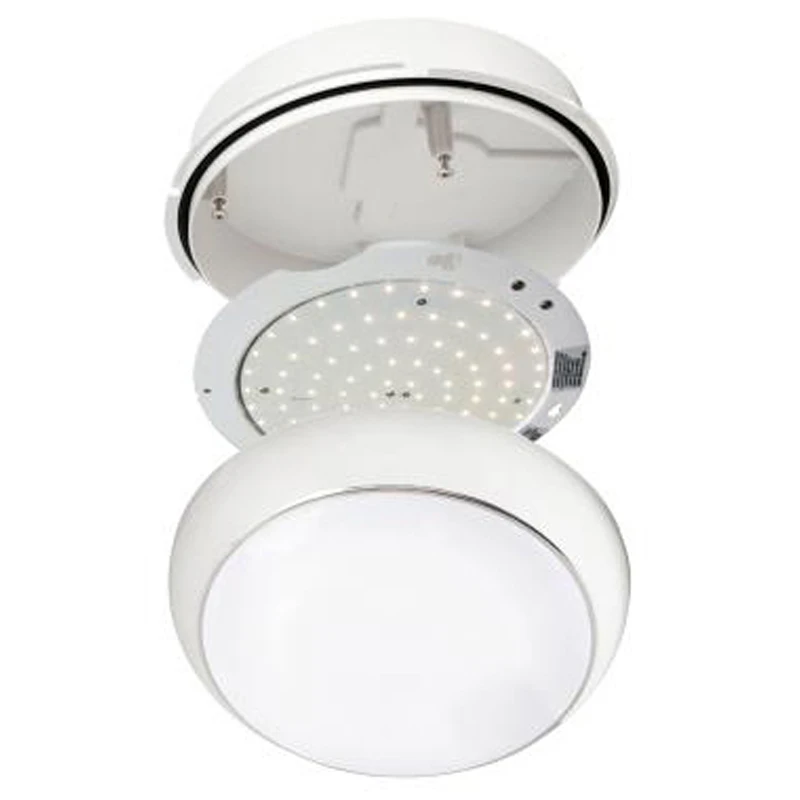 GOLF 10W LED with Pro-diffuser, IP65, 330mm, White, 4000K, emergency sensor · · · Suitable for use in retail shops, public buildings, communal areas, sports centres, stairwells, corridors, walkways · · LED replacement for 28W 2D fluorescent fittings · · High impact resistant polycarbonate housing · · Impact Rating of IK09 · · High efficiency Pro-diffuser allows maximum light transmission, provides low glare, creates even light distribution · · High efficacy of 82lm/W · · Chrome trim available (R282TRIM-03) · · Wide operating ambient temperature range of -20degC to +35degC · · Provides 3 hour emergency discharge duration