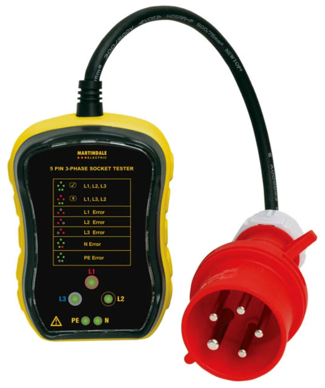 The PC105/32 is a 3-phase socket tester for checking supply faults and incorrect wiring of CEE 5 pin, 32A socket outlets. It will check for phase presence, phase sequence, PE presence and also checks for neutral presence. · · · 3-phase socket tester · · 5 pin configuration, 32A plug · · 7 wiring condition checks · · Phase sequence indication · · Bright LED indication