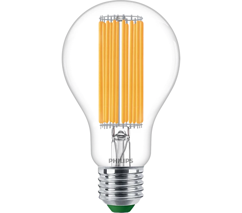 The new Ultra Efficient range of LED lamps and tubes from Signify combine industry leading efficiency of up to 210lm/w with a long 50,000 hour lifetime for a more sustainable lighting solution. · · · A Energy Rating · · 210 lumens per watt · · 7.3w replaces 100w bulb · · 3000K Warm White · · Attractive clear glass bulb · · 50,000 hour lifetime · · E27 cap · · 50,000 switching cycles