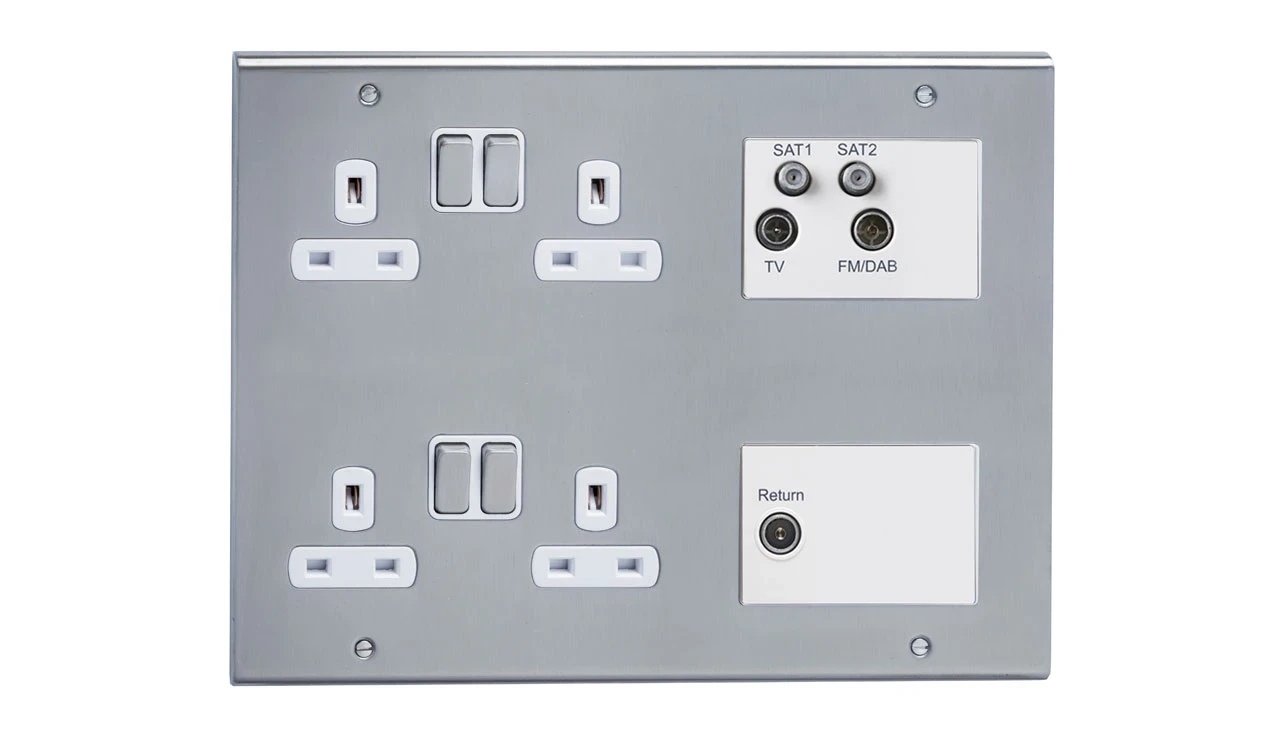 · · Unique slim profile metal front plate with curved top and bottom edges · · Includes: 4g 13A socket outlets with TV/FM (DAB) quadplexer, co-axial female and secondary telephone outlets alongside 4 data module spaces fitted with blanks · · Concave colour matched metal rockers · · Captive and backed out, top facing, colour coded terminals with large cable lead-ins and clear embossed and white printed markings · · Clear plastic gasket pre-fitted to the accessory to prevent tarnishing · · Protective film on frontplate prevents damage during installation · · Flush back box – 40mm deep (DB184) has segregation between LV and ELV sections. Supplied separately. · · BS 1363: Part 2 · · 2-year guarantee