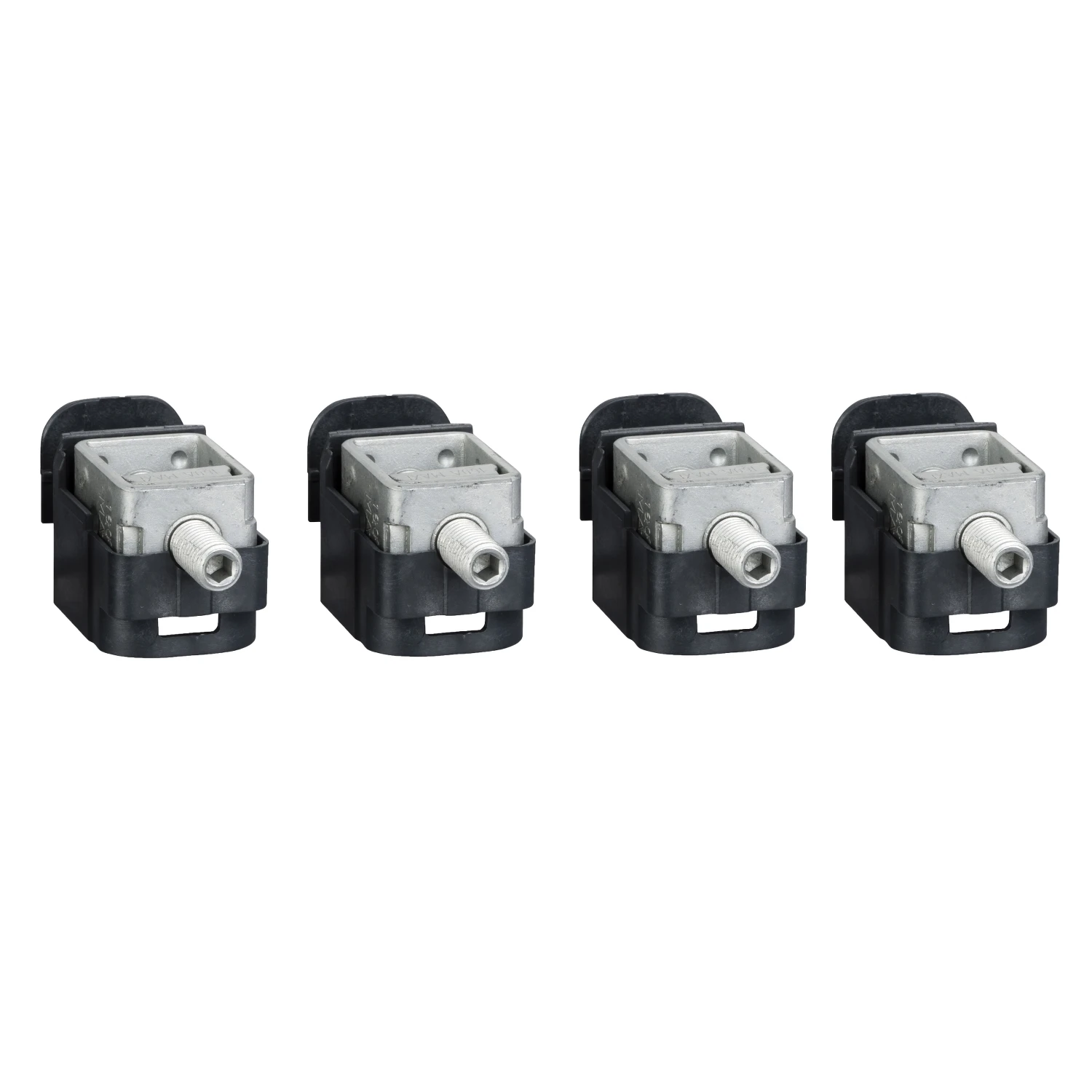 These accessories are steel bare cable connectors for Compact NSX 100/160 and EasyPact CVS 100/160. These connectors can receive 1 copper or aluminium cables from 1.5mm² to 95mm². The connectors snap directly on to the device terminals or are secured by clips to terminal extensions. The rated current is up to 160 A. They are sold by set of 4 parts. · · · These accessories are steel bare cable connectors for Compact NSX 100/160 and EasyPact CVS 100/160. · · These connectors can receive 1 copper or aluminium cables from 1.5mm² to 95mm². · · The connectors snap directly on to the device terminals or are secured by clips to terminal extensions. · · The rated current is up to 160 A.