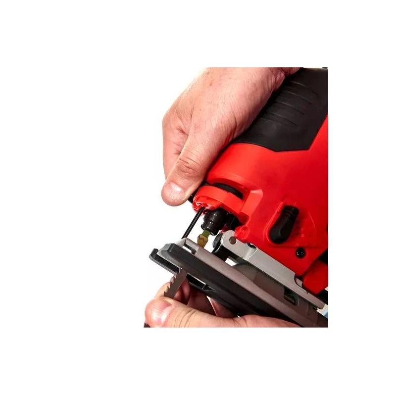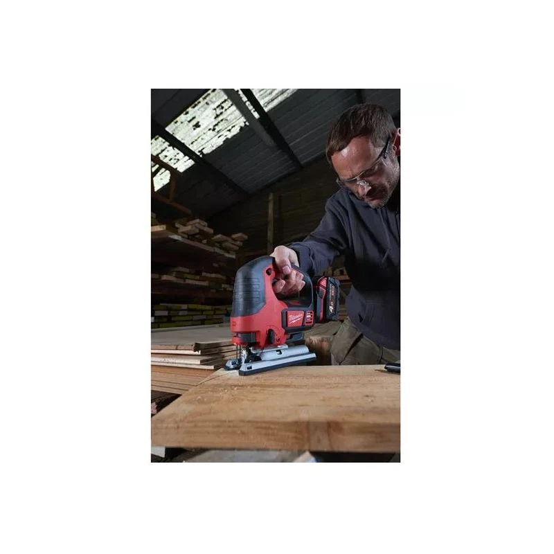 An 18V Jigsaw with a high performance motor, delivering 2800 spm for fast cutting. REDLINK overload protection electronics in tool and battery pack deliver best in class system durability. Patented FIXTEC clamp allows for fast keyless blade change and the keyless bevel facility on the base plate allows for adjustment between 0 – 45°. A five stage pendulum action allows for increased cutting performance. Flexible battery system: works with all Milwaukee M18 batteries. · · · High performance motor delivers 2800 spm for fast cutting · · REDLINK overload protection electronics in tool and battery pack deliver best in class system durability · · Patented FIXTEC blade clamp for fast and easy blade change · · Keyless bevel facility on the base plate allows for adjustment between 0 – 45° · · Five stage pendulum action for increased cutting performance · · LED light to illuminate the work piece · · Dust blower keeps the cut line free of wood dust · · Detachable soft shoe avoids marks and scratches when cutting soft materials · · REDLITHIUM-ION battery pack provides superior pack construction, electronics and fade-free performance to deliver more run time and more work over pack life · · No batteries supplied, No charger supplied, No kitbox or bag supplied