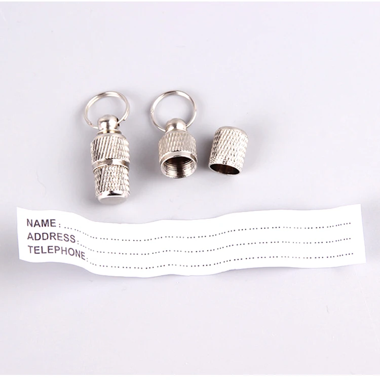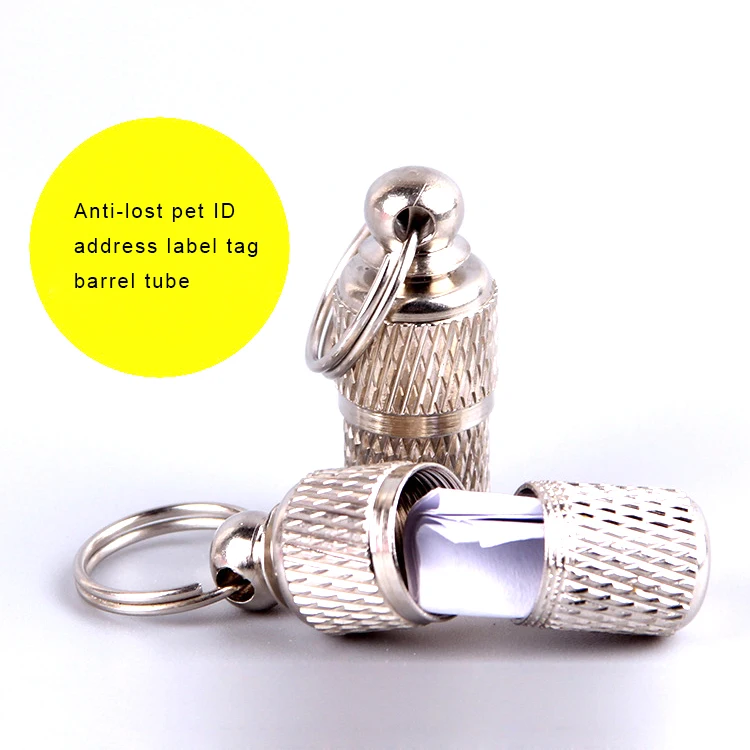 Tube barrel pet id tags Dimension (mm) : 10x24mm Art.nr. A1 Material: brass Nickel: free Address label: included Custom service : Custom packing is available, if need, pls contact us . Remark: There are no sharp edges, an excellent pet accessory, very suitable for all types of dogs and cats Made of stainless steel, small and light but very strong, easy to attach to everything with a small ring And it’s waterproof, so you don’t have to worry about the information in the capsule getting wet from the rain on rainy days. The pet tag is a great way to identify your pet. It attaches easily to the pet’s collar and has a high quality screw mechanism that attaches well Contact information can be written in it to prevent the missing (leave dog’s name, phone number and other contact information) Detailed Images.