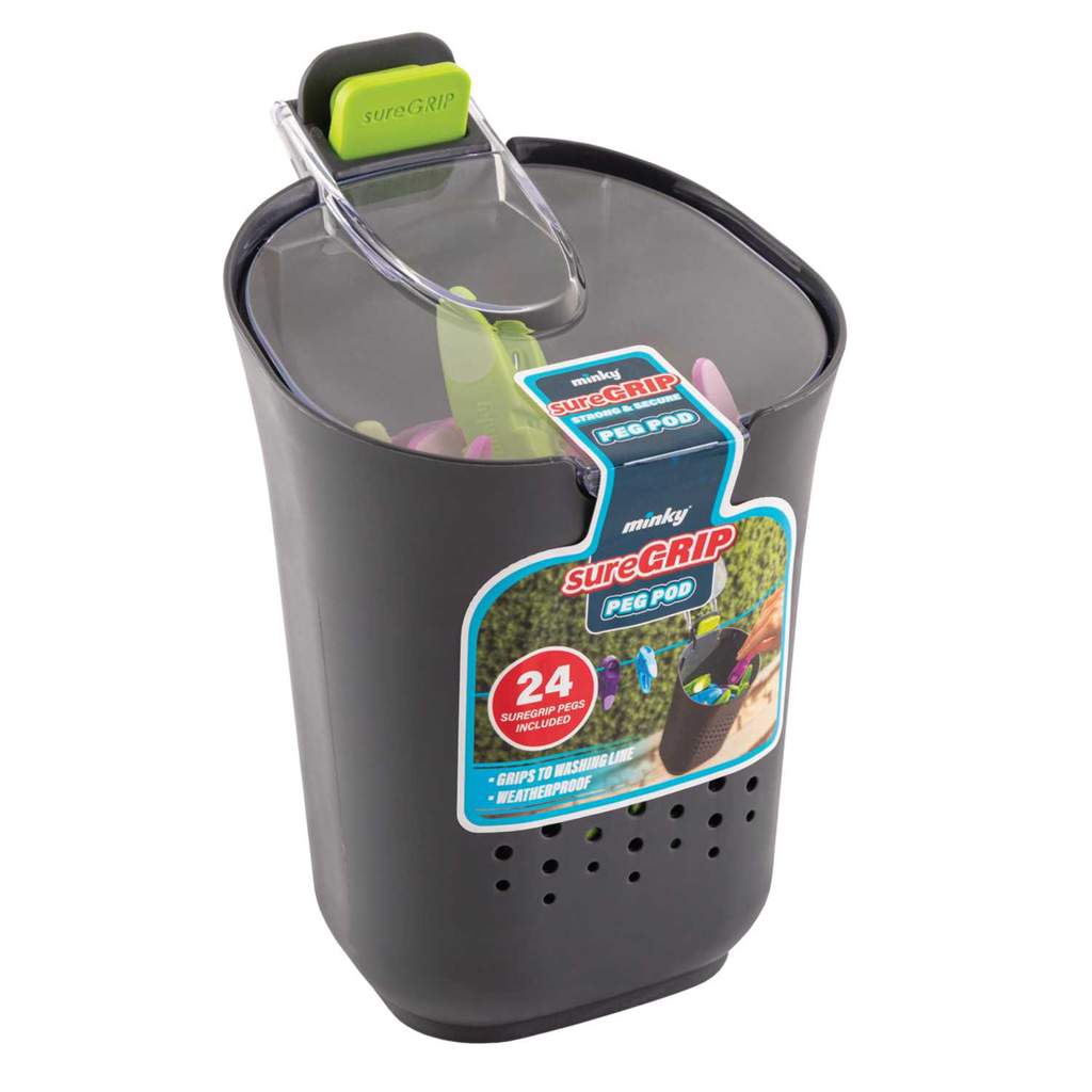Surgrip Clip attaches to washig line | Ideal peg storage pod for your washing line | Includes 24 Minky Sure Grip Pegs | Sure Grip clip – securely attaches pod to a washing line | Lid to secure pegs inside | Durable and weatherproof material | Drainage holes – aid external weather conditions