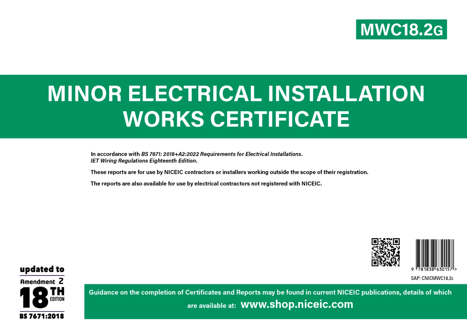 The NICEIC Minor Electrical Installation Works Certificate is to be used only for an addition or an alteration to a single circuit that does not extend to the provision of a new circuit. Examples of where this certificate may be used include the addition of a socket-outlet or a lighting point to an existing circuit. This Certificate may also be used for the replacement of equipment such as accessories or luminaires, but not for the replacement of distribution boards or similar items. · · · Method Handwritten · · Scheme Approved Contractor · · Official documentation of the safety and compliance of minor electrical installation works