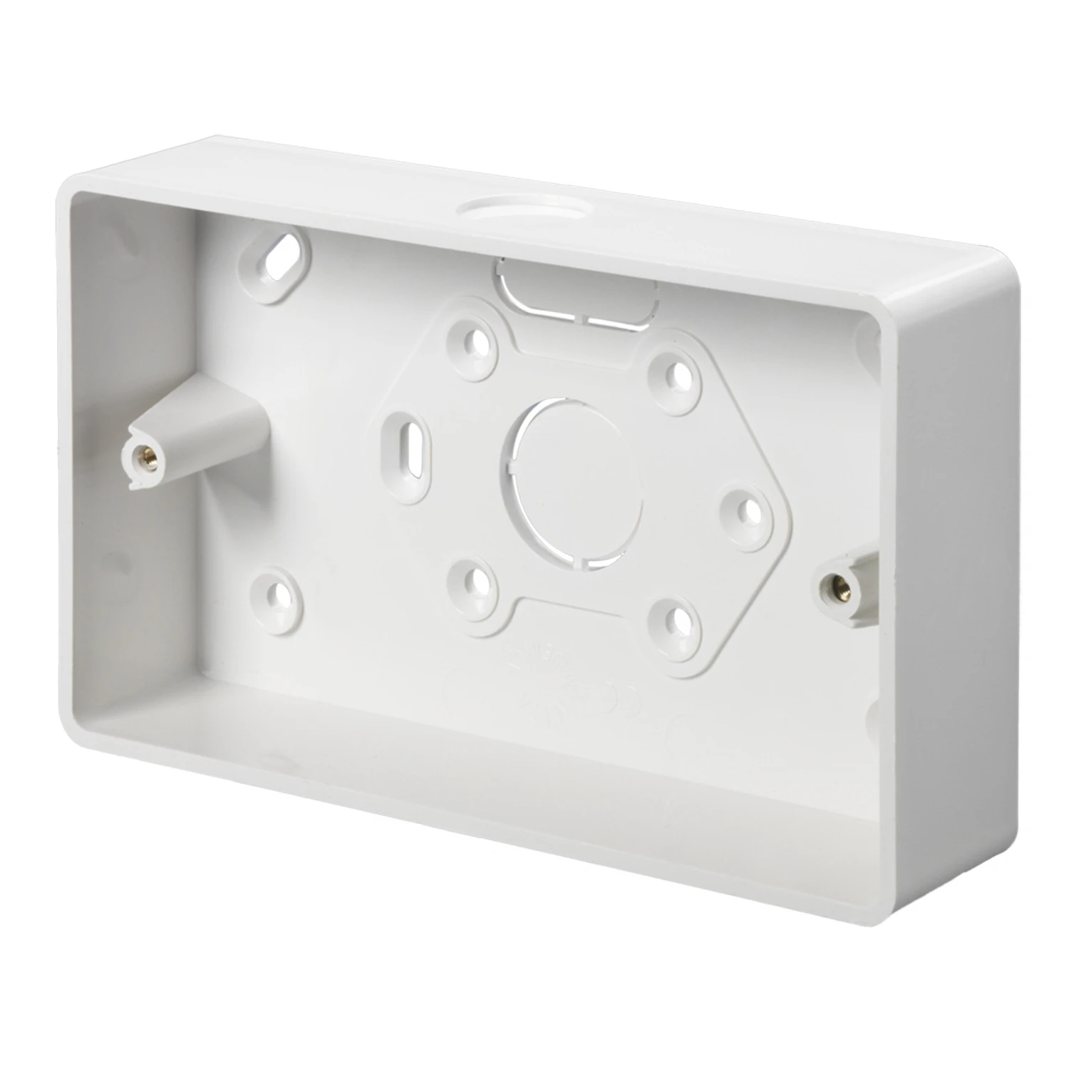 Round corner box suitable for popular wiring accessories. · · · Surface mounting box · · 2 gang · · 32mm depth · · Knockout cable entry · · BS 4662