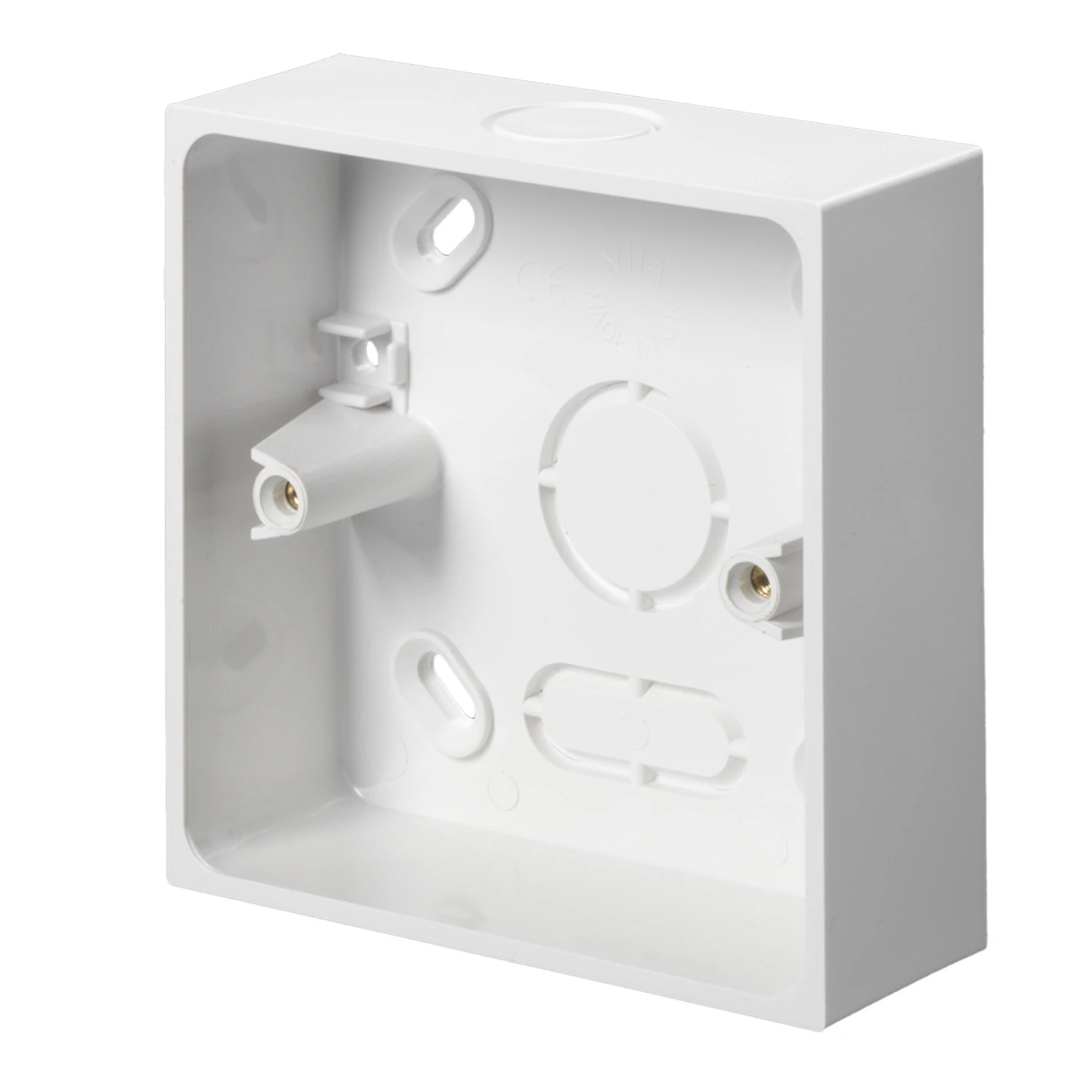 1 Gang Single PVC Square Corner Box 32mm · · · Square corners · · 32mm deep · · BS 4662 compliant · · Non-brittle for ease of drilling · · Cable entry knockouts · · Wall mounting support