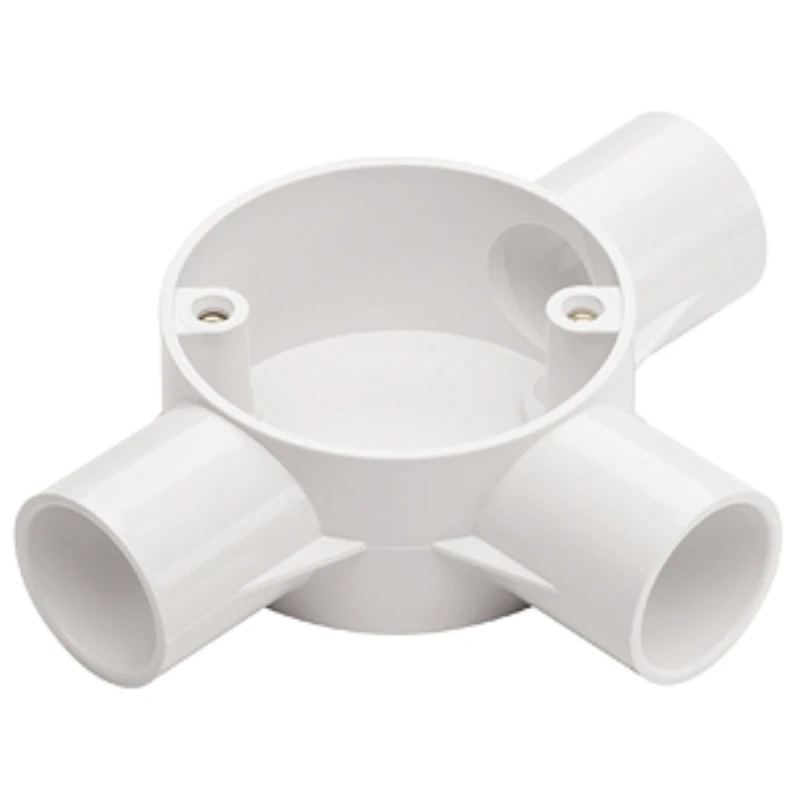 Circular T-Connection conduit box made up of a white polyvinyl chloride (PVC) housing body, designed for use as an accessory for electrical conduits. Suitable for use in industrial and commercial environments and is capable of suspending load of up to 3kg · · · Fixing centre is 50.8mm and fitted with M4 brass insert. · · Durable and impact resistant · · Simple and fast installation · · 2 x 90° Angles