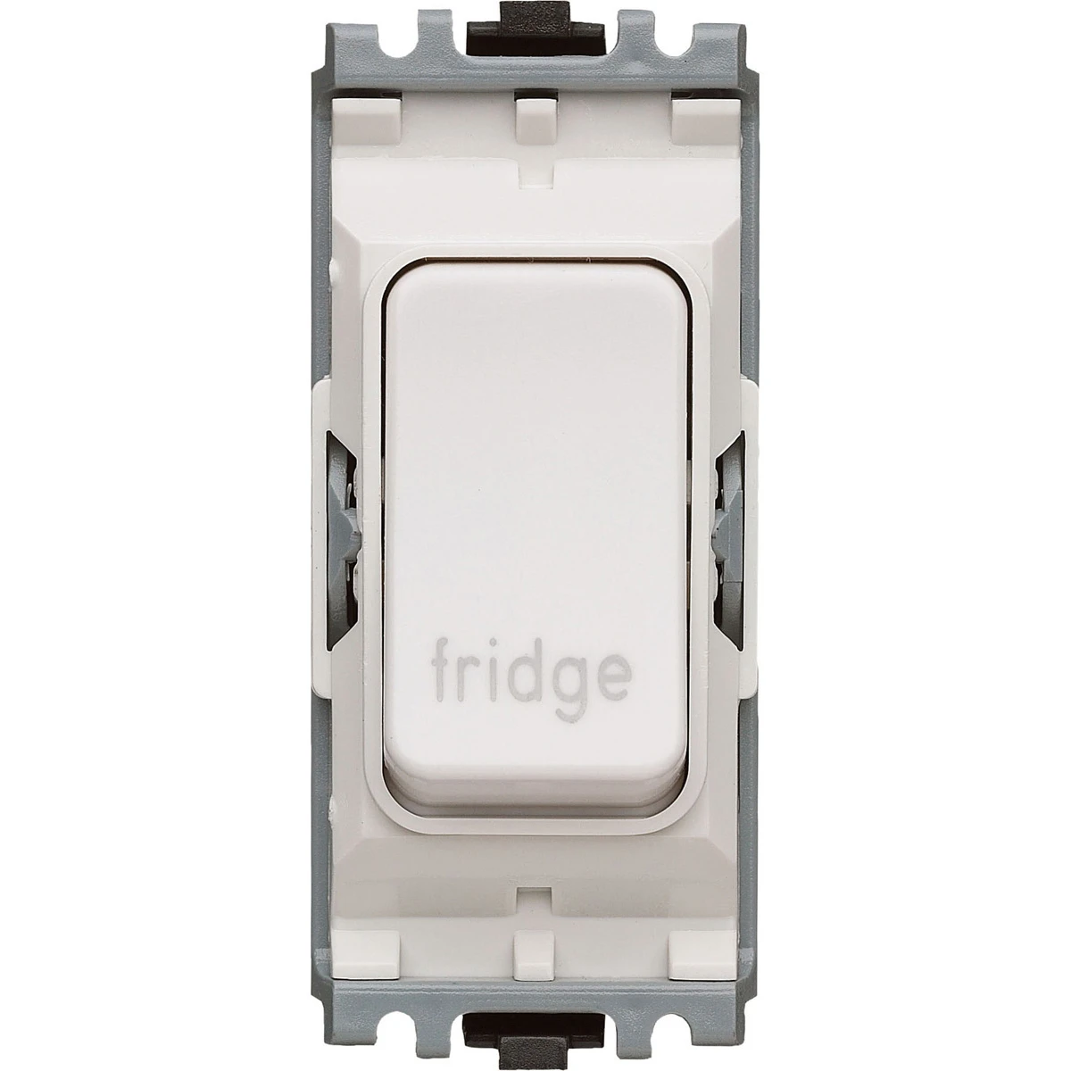 The switch module features easy to fit and change, simply clip into place from the front of the mounting frame. The grid module clips to the frame without any requirement for special tools. It can be moved, removed or replaced whilst the frame is fitted to the box making installation or replacement speedy and simple. The simple clip fit mechanism holds to the mounting frame in order to place from the front. This switch does not have to be derated when used with fluorescent or inductive loads and is manufactured according to BS EN 60669-1:1999 standards. · · · Current rating 20A · · No. of gangs 1 · · No. of ways 1 · · No. of poles 2 · · Switched/Unswitched: Switched · · Voltage 230 V · · Legend Fridge · · Rocker Colour White