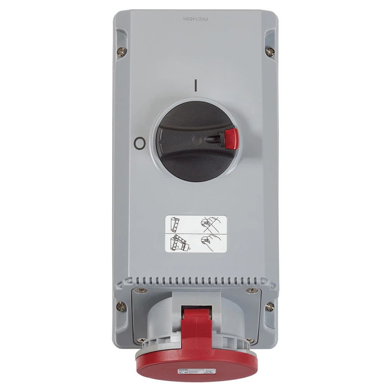 Technical Specifications Technical Specifications CEE switched socket outlet Model Base unit and cover Degree of protection (IP rating) IP67 Voltage acc. EN 60309-2 380-415 V (50+60 Hz) red Identification colour Red Number of poles 3 IEC-amperage 63 A Clock hour position 6 h