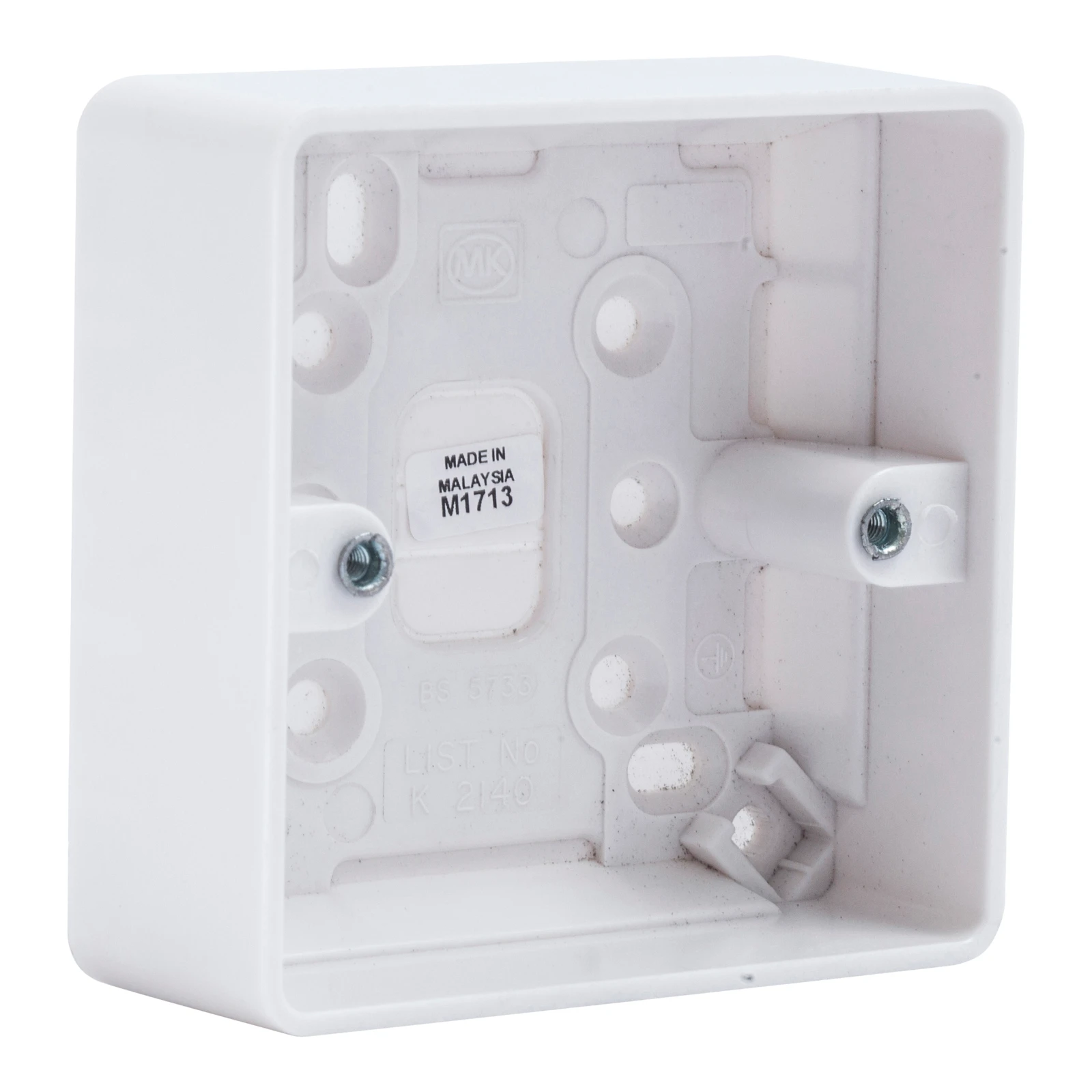 1 Gang Surface Mount Moulded Box 87 x 87 x 30 mm White for use with conventional wiring accessories. Check wiring accessory installation instructions for suitability. · · · Made from PVCu · · Fixing centre: 60.3mm · · Surface mounted · · Knockouts in base and sides for cable entry · · Screwed terminals for connection