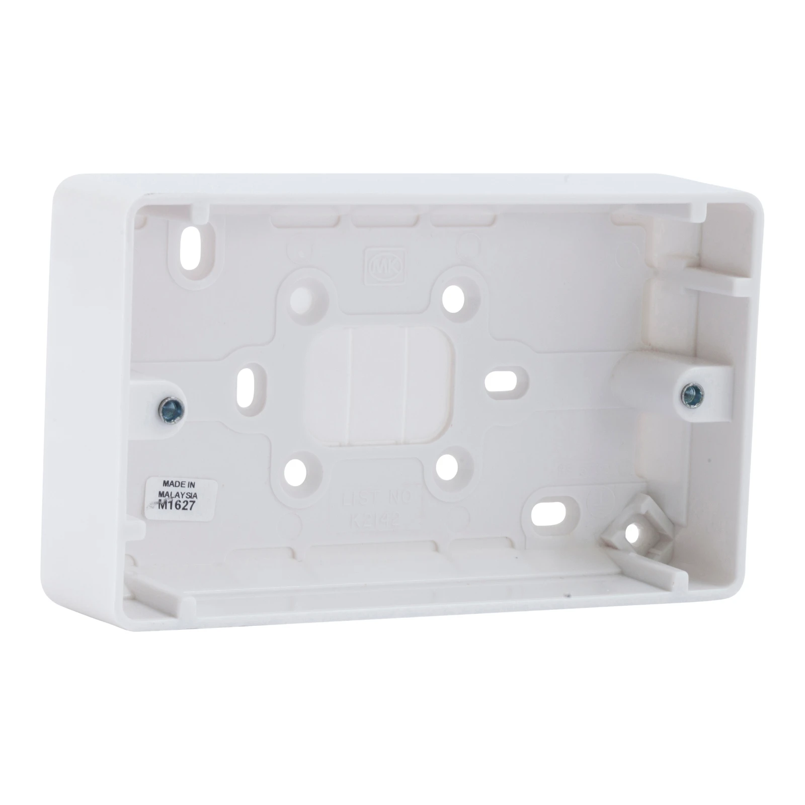 2 Gang Surface Mount Moulded Box 148 x 87 x 30 mm White for use with conventional wiring accessories. Check wiring accessory installation instructions for suitability. · · · Made from PVCu · · Fixing centre: 120.6mm · · Surface mounted · · Knockouts in base and sides for cable entry · · Screwed terminals for connection
