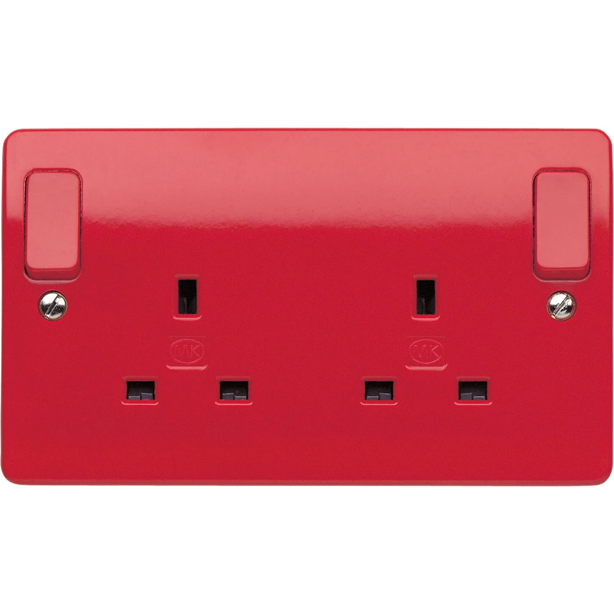 MK Logic Socket 2 Gang Switched Double Pole Dual Earth 13A Red Red Outboard Rocker