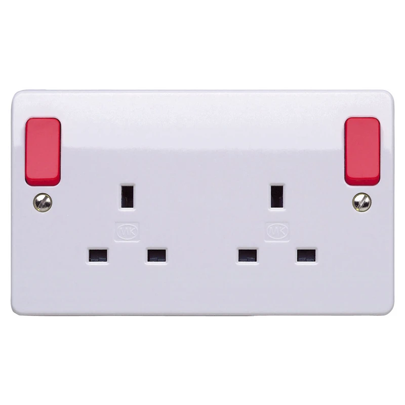 MK Socket 2 Gang Switched Double Pole Dual Earth 13A White Green Rockers
