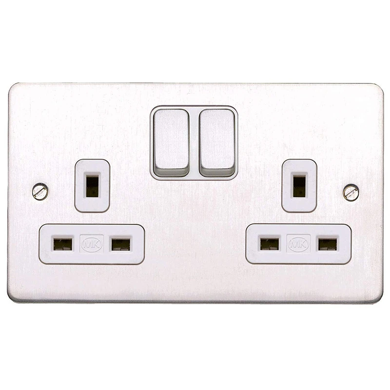 MK Socket 2 Gang Switched DP Clean Earth 13A Brushed Stainless Steel White Insert