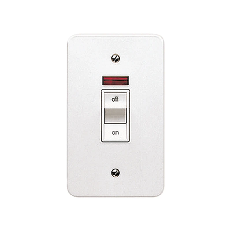 Positive switch action, Positive double pole switching, Metal frontplates, Supplied with mounting box, Earth terminal fitted on base of box, Not recommended for switching large backs of pc’s · · · Colour: White, Material: Blend of Urea Formaldehyde & Melamine, Insert Colour: White · · Current Rating: 45A, Voltage Rating: 250V AC · · Height: 150mm, Width: 89mm, Depth: 50mm · · Mounting Type: Surface · · Number of Poles: Double Pole · · Terminal Capacity: 16 sq mm · · Switched Unswitched: Switched, With Neon: With Neon · · IP Rating: IP4X · · Number of Gangs: Single Gang, Number of Ways: One Way