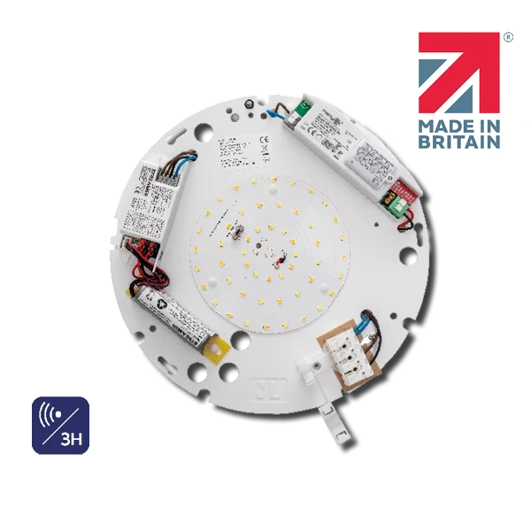 This option comes equipped with an integral microwave sensor, designed to detect motion and adjust the light accordingly with 0% or 10% Standby options. When an area is unoccupied, the sensor dims the light, reducing energy consumption. As soon as movement is detected, the Gear Tray instantly brightens up, ensuring that light is available precisely when and where it’s needed.It also comes with a 3 Hour Emergency function, adding an extra layer of safety and convenience. During power outages or emergencies, the Gear Tray seamlessly transitions into emergency mode, providing reliable lighting for up to three hours.Say goodbye to time-consuming and costly replacements.The Duxford Gear Tray is engineered for swift and simple retrofitting into any existing bulkhead housing with its multiple mounting points, reducing installation time and minimising disruption.Tailor the lighting experience to your clients’ specific needs. With selectable colour temperature options of 3000K, 4000K or 5500K, our Gear Trays allow you to create the perfect ambiance for any environment, whether it’s warm and inviting or crisp and focused. · · · Detection range from 2m to 10m · · Hold time from 5 seconds to 10 minutes · · Daylight threshold · · Corridor function 0% or 10% · · Selectable 3000K, 4000K or 5500K colour temperature · · Multiple mounting points for retro fit into existing housings · · Quick release Gear Trays · · Powder coated
