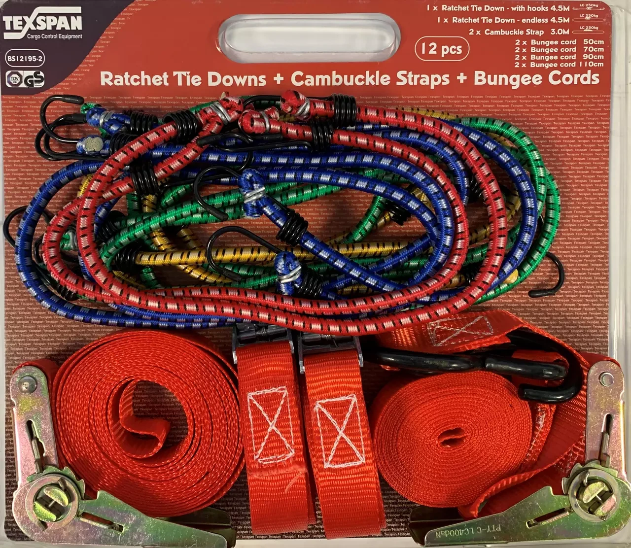 Texspan multi lash bungee retail pack, retail pack:1 ratchet tie down with hooks 4.5m lc250kg — red,1 ratchet tie down endless 4.5m lc250kg — red,2 cambuckle strap 3m lc250kg — red,2 bungee cord 50cm — red,2 bungee cord 70cm — yellow,2 bungee cord 90cm — blue,2 bungee cord 110cm — green · · · Material: Polyester, Steel · · Marking: According to standard · · Standard: EN 12195-2 · · Secure a wide variety of loads, from light to heavy · · Protect your cargo from damage · · Increase safety and efficiency