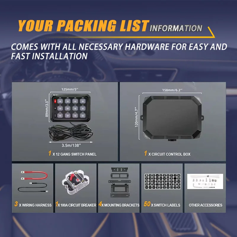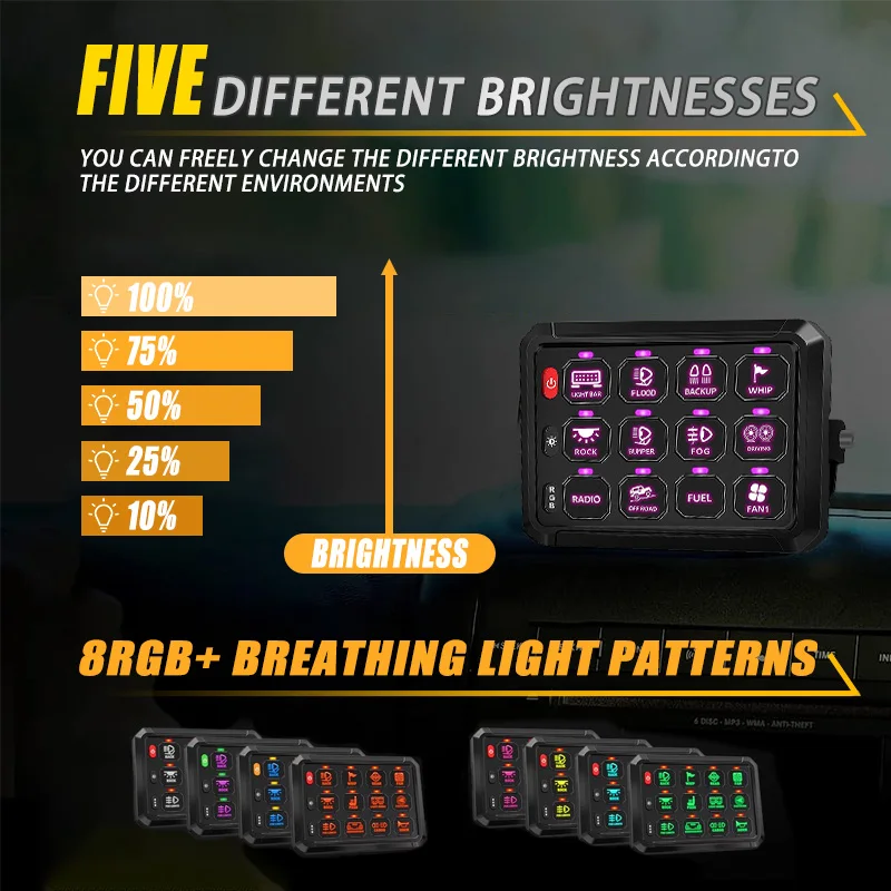 Product Description Products name Dimming 12 Gang Switch Panel Car Make Universal Truck 4WD Fit for Driving lights; Light bar; Led whip; Fog lamp, etc. Material Diecasting aluminum alloy housing Maximum Current/Circuit 60A (8 Bit)/ 80A (12 Bit) Maximum Power 960W@12V / 1920W@24V Temperature – 40°C ~ + 85°C Color changer Dimmable MOQ 2 Sets Certificate FCC、CE Please “ Send Inquiry ” To Get The Best Price Recommended by seller Remote Bluetooths APP Control 3ft 4ft 5ft 6ft Flexible Spiral RGB Color Antennas Offroad Car Rzr UTV ATV Flag Led Whips Light.
