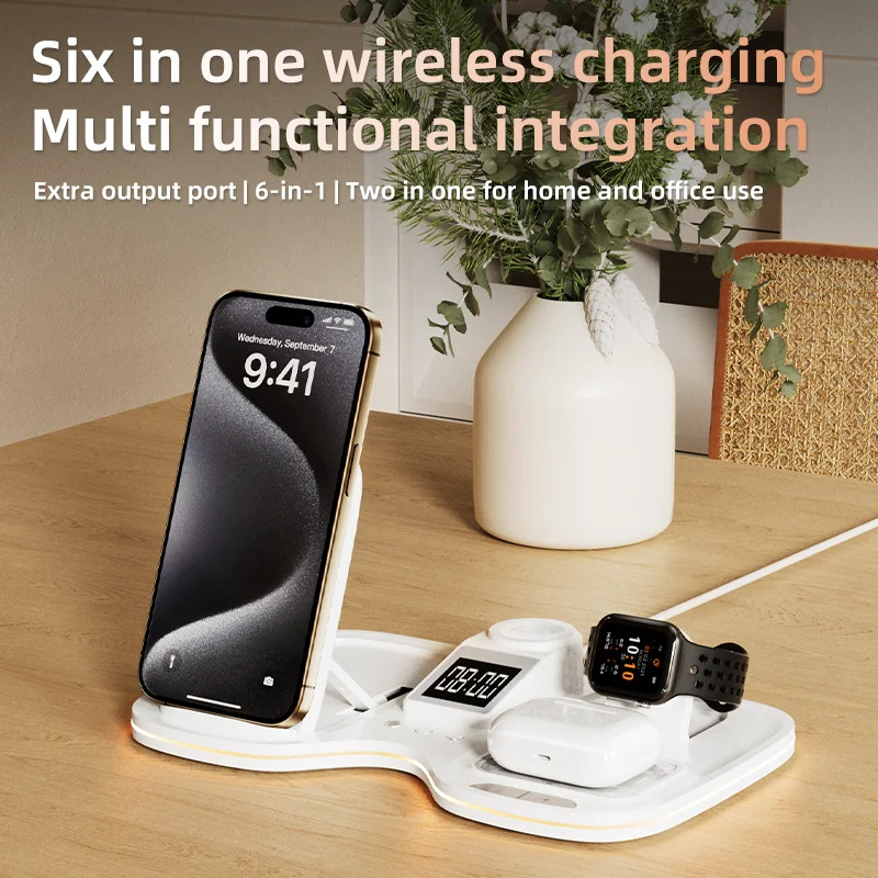Multifunctional 6 In1 Foldable Magnetic Wireless Charging Dock for iPhone Smart Watch 15W Fast Charging With Light Alarm Clock