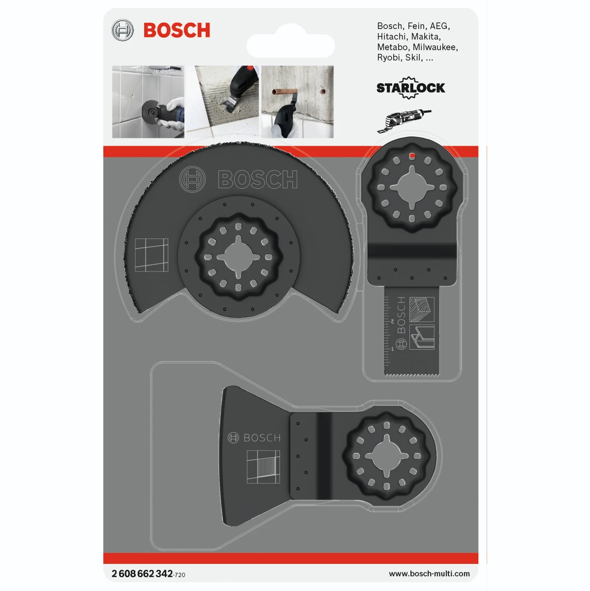 The 3-piece Basic Tile Set provides the main accessories for tile and bathroom applications. These Starlock accessories have been carefully selected for basic tile and bathroom renovations. The three Starlock blades enclosed allow for routing grout joints between tiles, scraping mortar and plunge cutting wood and non-hardened metal. These accessories are designed particularly for work such as routing joints and smaller cutouts in soft wall tiles, scraping mortar or tile adhesive and plunge cutting in copper pipes. The Starlock Snap-In mounting system allows fast blade removal and exchange within 3 seconds without having to touch the blade. The mounting system produces the highest power transfer due to a 3-dimensional tight-fitting connection between machine and accessory. All Starlock, Starlock Plus and Starlock Max power tools as well as common multi-tools are compatible with these accessories. · · · Essential Tile and Bathroom Applications · · 3-piece tile set Versatile tile set for renovation and reconstruction work (e.g. routing joints on wall and floor tiles, removing mortar or tile adhesive, routing smaller cutouts in soft wall tiles) · · 3-piece tile set Versatile tile set for renovation and reconstruction work (e.g. routing joints on wall and floor tiles, removing mortar or tile adhesive, routing smaller cutouts in soft wall tiles)
