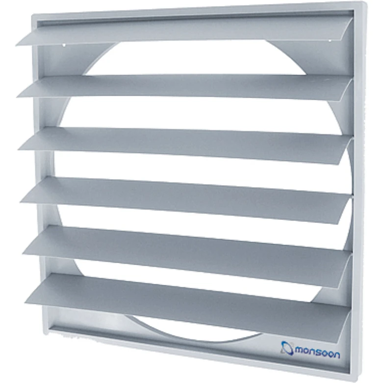 Monsoon grey 300mm louvred back draught gravity shutter 343x343mm. · · · Louvre back draught shutter · · Manufactured from UV stabilised plastic · · Supplied as standard in grey colour