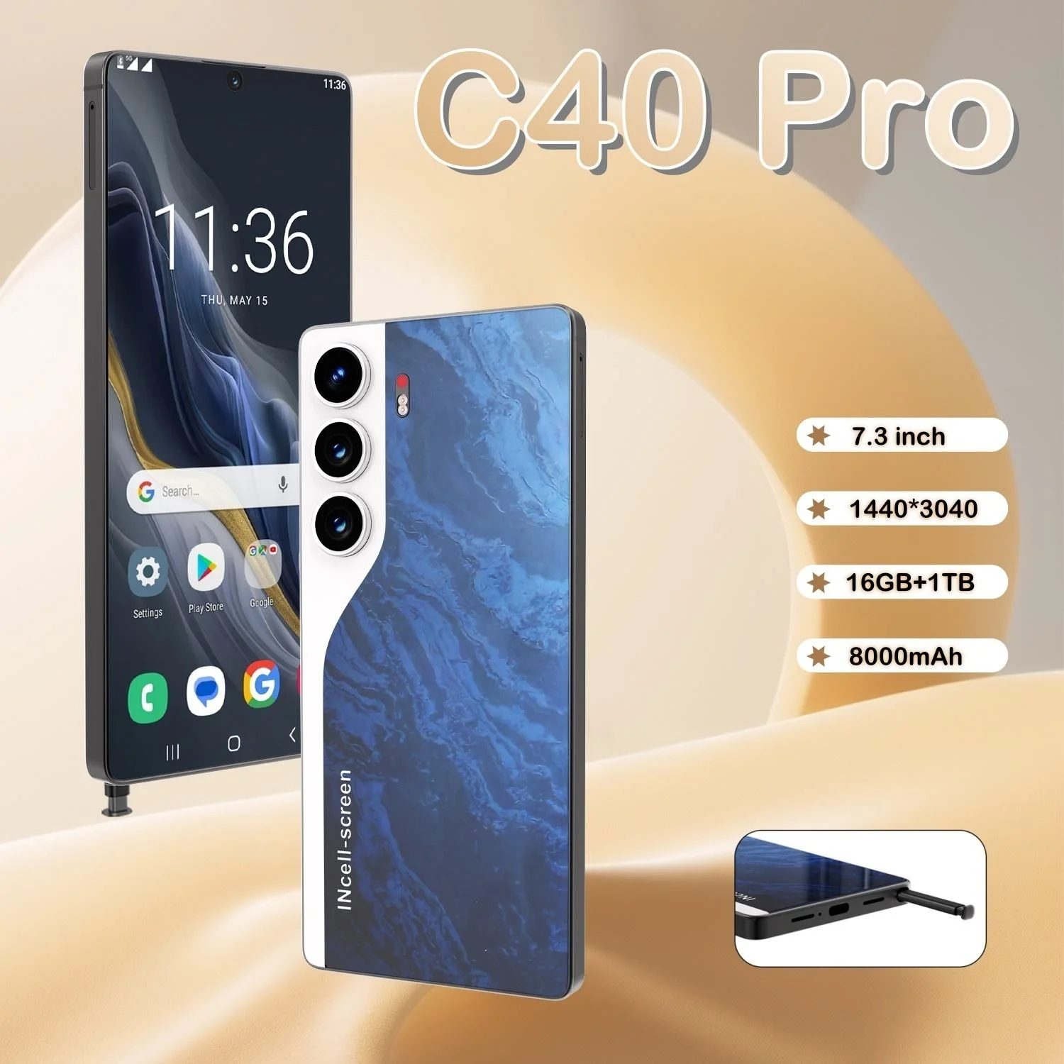 brand name custom model number C40 Pro screen resolution HD feature Beauty Camera,Dual SIM Card,Face Recognition,Fingerprint,Gaming operation system Android 15 screen size >7″ cellular CDMA,GSM,LTE,5 G cpu Deca Core front camera 72MP operating language English,German,French,Dutch,Spanish,other rear camera 108MP display type OLED battery capacity Above 8800mAh processor brand MTK Dimensity series display refresh rate 144HZ place of origin shenzhen cellular band GSM850/900/1800/1900MHz, 3G: WCDMA850/2100MHz,4/5G customized packaging 0.5kgMobile Phones Original Smartphone Screen Size 7.3inch Type 3g 4g 5g Smart Phone SIM Card Dual SIM Card + TF Card OS System Andriod 15 Language Muti-language Support Function WhatApp/MP3/FM Radio/recorder Color Black/Green/Blue Version Gloabal Version.