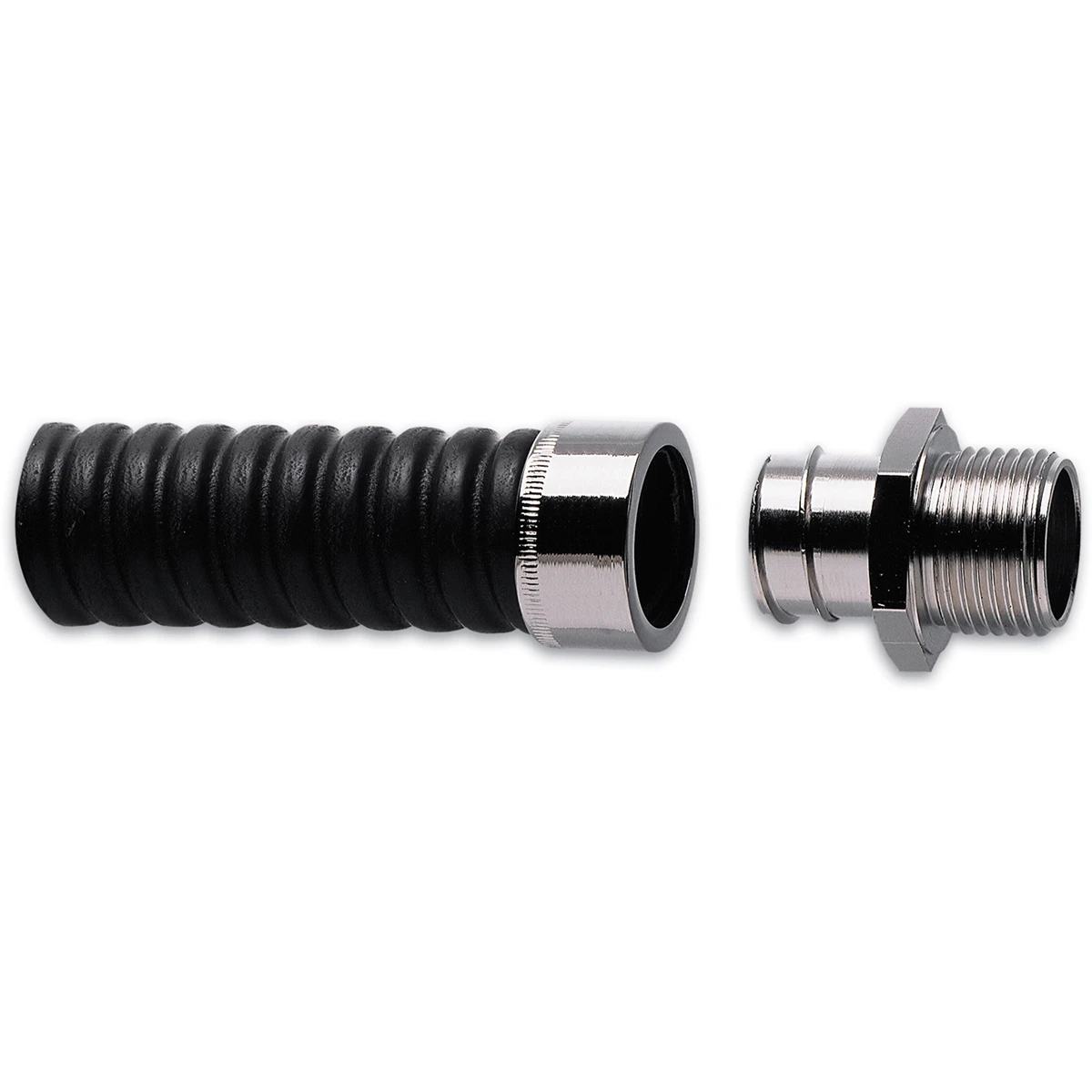 Straight fitting made up of a black polyvinyl chloride (PVC) and solid steel construction designed for use as an accessory for flexible electrical conduits. Suitable for use in industrial and commercial environments. · · · IP54 fittings · · IP54 fittings · · CE Marked · · CE Marked