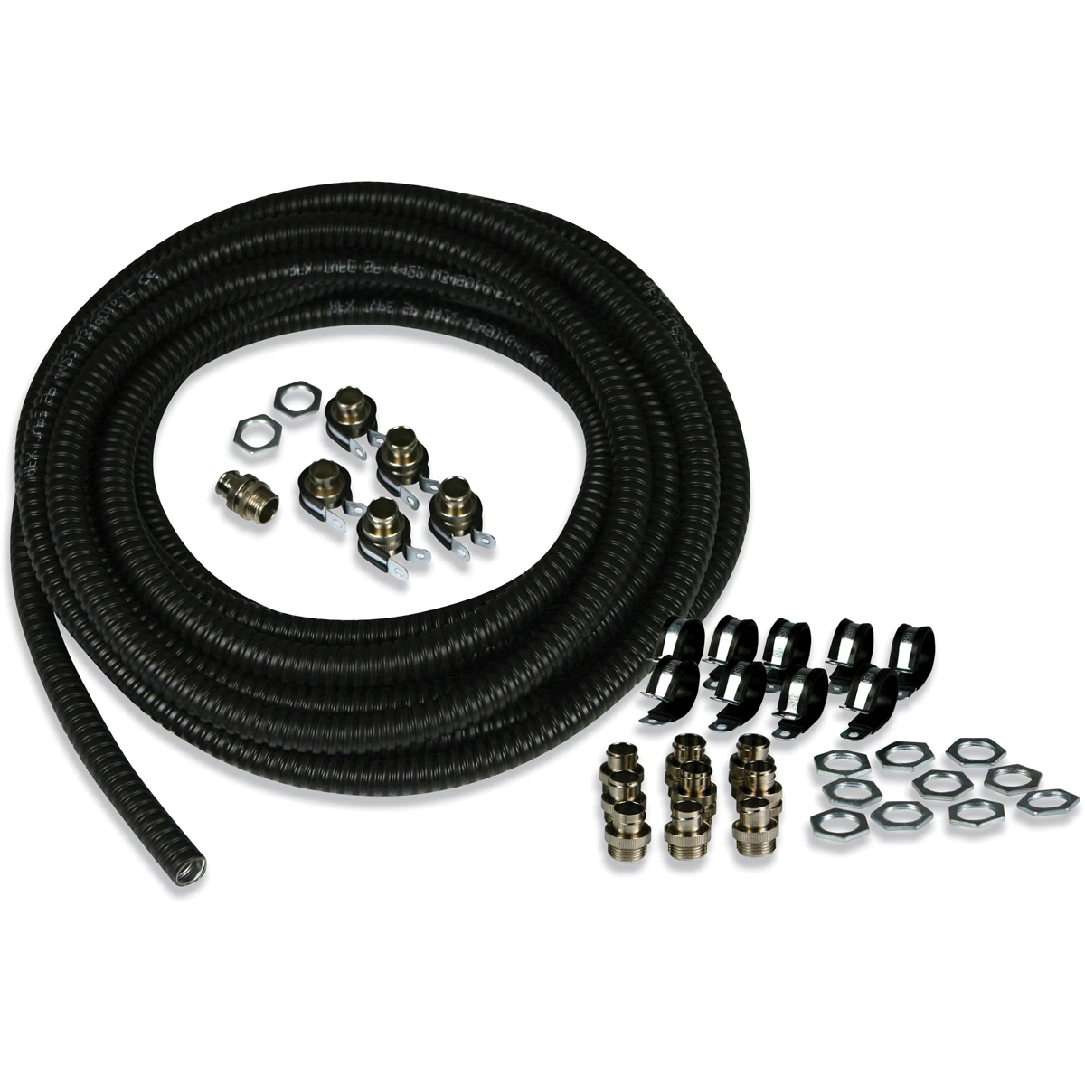 Kit includes: 10m flexible PVC covered steel conduit, 5 x ‘A’ fittings (fixed external thread), 5 x ‘B’ fittings (swivel external thread), 10 P-clips · · · Kit includes: 10M flexible PVC covered steel conduit, 5 x ‘A’ fittings (fixed external thread), 5 x ‘B’ fittings (swivel external thread), 10 P-clips. · · Versatile fittings for installation into knockouts using a locknut, or into threaded entries · · Excellent crush & tensile strength · · Excellent chemical & UV resistance · · Fittings complete with locknuts · · IP54