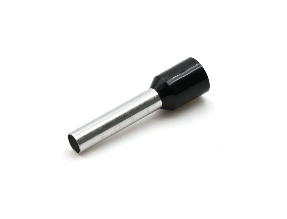 6mm² Polypropylene insulated end sleeve 12mm pin length black · · · Insulated end sleeves provide a neat end termination to multi-stranded wires, and are suitable for tri-rated cable · · Reduce the possibility of wire strands short circuiting and ensures a positive connection when used with terminal blocks and captive terminals · · Manufactured from bright tinned copper with polypropylene insulated sleeves · · Available in either French or German colour codes · · Manufactured to DIN 46228 · · For Flexible Copper Conductor