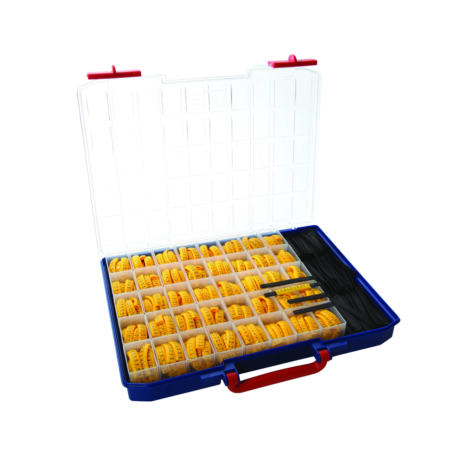 Contains 100 of each black & yellow markers: A-Z, 0-9, +, -, /, Earth. Also contains 200 x 12 digit carrier strips and 100 x 7 digit carrier strips · · · Self extinguishing PVC · · Temperature range -45?C to +70?C · · Chemical resistant · · Mixed Marker Kit – NLCM1KIT Contains 200 of each colour coded markers: 0-9 (Coloured), L, N, R, S, T, +, -, Earth (White) and 1 applicator · · Black and White Marker Kit – NLCM2KIT Contains 200 of each black & white markers: A-Z, 0-9, +, -, Earth, Full Stop, Blank, L1, L2, L3 and 1 applicator · · Black and Yellow Marker Kit K Type – NLCM3KIT · · Contains 100 of each black & yellow markers: A-Z, 0-9, +, -, /, Earth. Also contains 200 x 12 digit carrier strips and 100 x 7 digit carrier strips