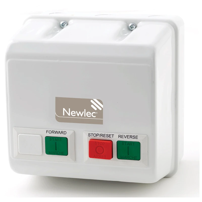 Newlec reversing starter made up of steel enclosure with stainless steel pozidrive fixing screws for it’s lid. This starter comes with an isolator. · · · Manufactured in accordance with EN60947-4-1 · · IP55 steel enclosure · · Colour RAL7035 light grey · · Surface mounting · · Standard coil voltages: 230V or 400V 50/60Hz · · Built in start/stop and reset push button · · Hand reset thermal overloads · · Overload to be ordered separately, see page XX · · Stainless steel pozidrive fixing screws for lid · · Knockouts top and bottom