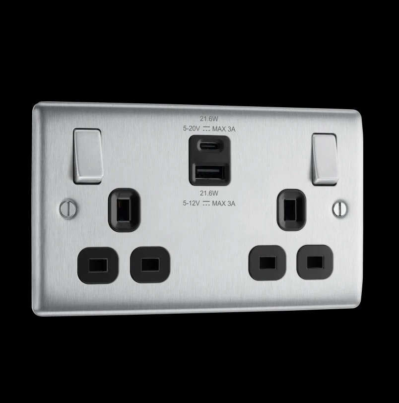 Nexus Brushed Steel Double Switched Socket 2G USB Type A + Type C 13A 22W