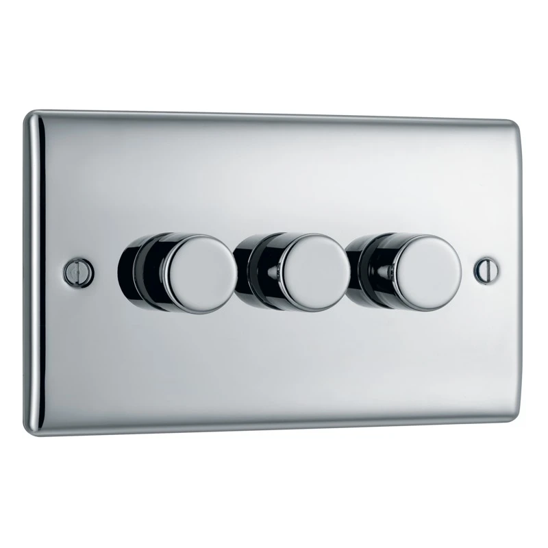 Nexus Metal Polished Chrome 3 Gang 2 Way Push Type Trailing Edge 200W Push Type Dimmer Switch