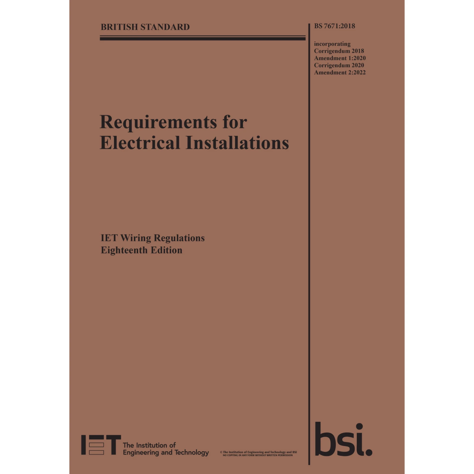 Get up-to-speed on the requirements of BS 7671: 2018+A2:2022 The IET Wiring Regulations is the national standard to which all domestic and industrial wiring must conform. It is essential to all those concerned with the design, installation and maintenance of electric wiring in buildings. The 18th Edition is a major update to this title and contains extensive changes to many areas of BS 7671. The 18th Edition has been further updated to include two subsequent amendments as BS 7671:2018+A2:2022. · · · Latest 18.2 Regulations update · · Includes amndments BS 7671:2018+A2:2022. · · Author: IET · · ISBN: 978-1-83953-218-4 · · Released 28th March 2022