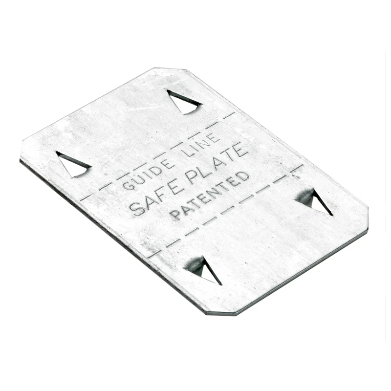 Rectangular safe plate made from a solid steel body complete with a galvanized surface finish, designed to be suitable for the protection for wiring and pipes. · · · Protects pipe and cable from penetration damage · · No fixings required · · Anti-penetration material (Nails and screws when installing) · · Assists with compliance to IEE regulations · · Meets NHBC requirements · · 1 year warranty