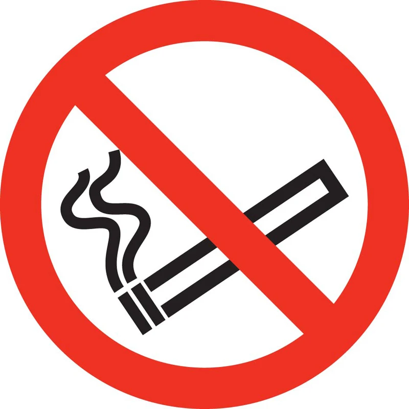 Health and safety symbol with a “No Smoking” image in a circle measure at 80mm diameter. Red and black used to indicate certain behaviour is forbidden. · · · Self adhesive sign · · Black image with red stop symbol