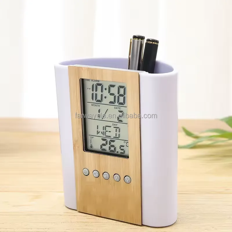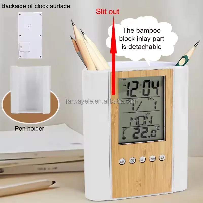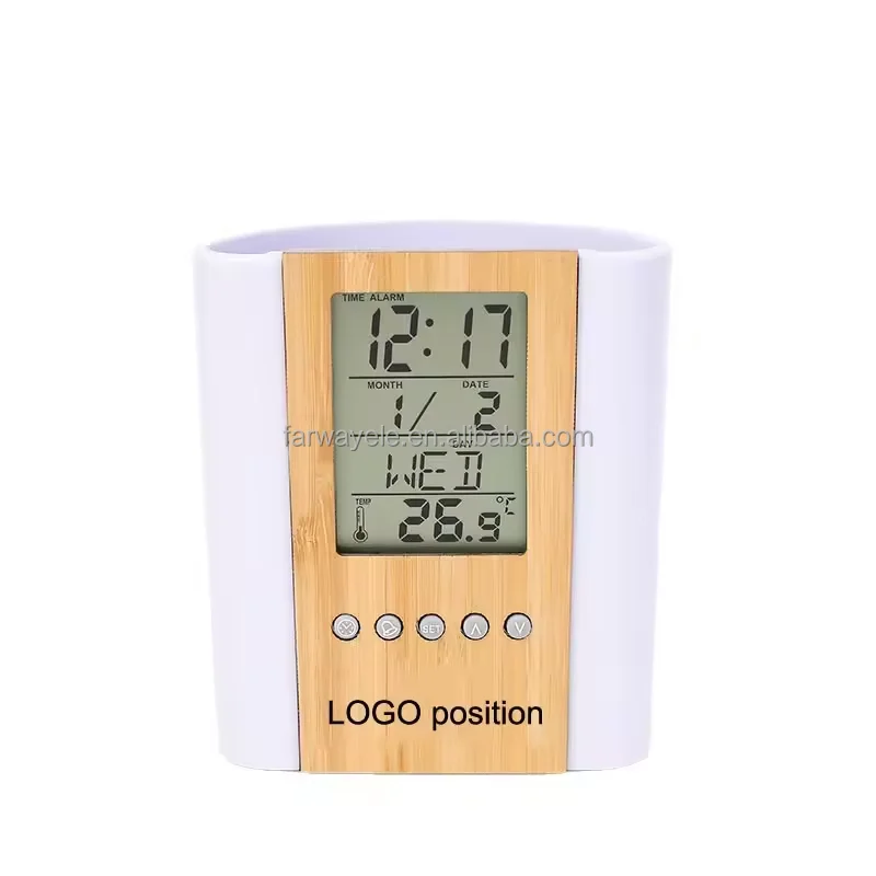 Product Description Item Electronic digital bamboo pen holder penstand LCD table clock Color Silver/White or customise Function Time mode/Daily alarm and snooze /Birthday reminding/Countdown timer /Temperature/Music appreciation Material ABS+bamboo Power CR2025 Size 10.1*5.1*11.