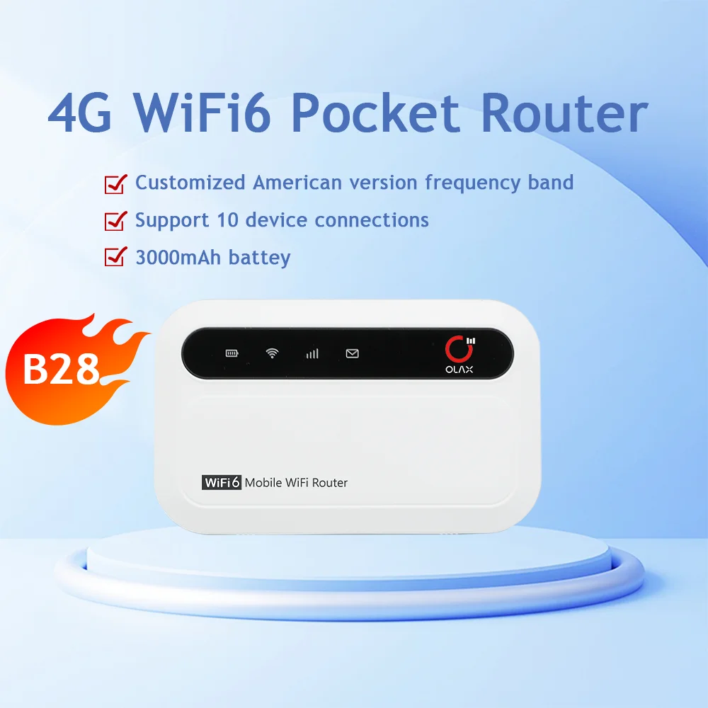 Please contact our sales staff to confirm that the bands supported by the device are suitable for use in your country, or you can check it out by yourself through the following link: https://www.frequencycheck.com/ Enter the country in the search box and click on the search, you can see the bands used by the operators. MF985 support : American Band:B2/3/4/5/7/13/28/41 European Band: B1/3/5/7/8/20/28/38/40/41 Brand: OLAX Material: All products are made with new materials and chips Personalized features: SMS/WPS function Appearance color: black with color screen Battery capacity: 3000mah Performance: cat4, 150mbps Shipping Time: Delivery within 3 days for in-stock, 28-35 working days for customized products Guarantee: support one year warranty Quality issues: support online after-sales guidance, if necessary, remote computer to check Specification item MF985 Max. LAN Data Rate 150Mbps With Modem Function NO Standards And Protocols Wi-Fi 802.11g, Wi-Fi 802.11b, Wi-Fi 802.11a Wi-Fi Supported Frequency 2.4G Supports WDS No Supports WPS Yes Wi-Fi Transmission Standard 802.11n Wired Transfer Rate None 2.4G Wi-Fi Transmission Rate 150 Mbps Encryption Type WPA2-PSK, WPA2, WPA Private Mold YES Products Status New Type Wireless Application MINI WIFI Function Voip, FireWall, QoS, VPN LAN Ports 0 Brand Name OLAX.